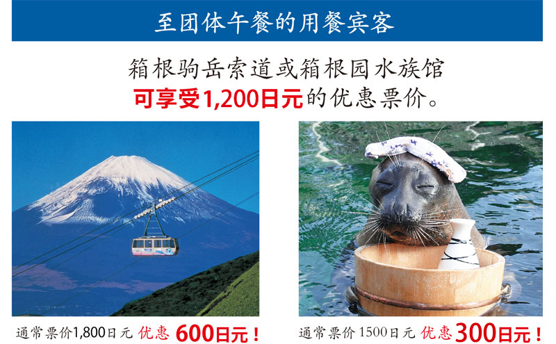 坐在湖畔特等席,欣赏着眼前一望无际的箱根芦之湖美景,享受优雅的午餐时间。用餐前后还可去箱根驹岳索道、箱根园水族馆游玩,或是享受购物的乐趣。