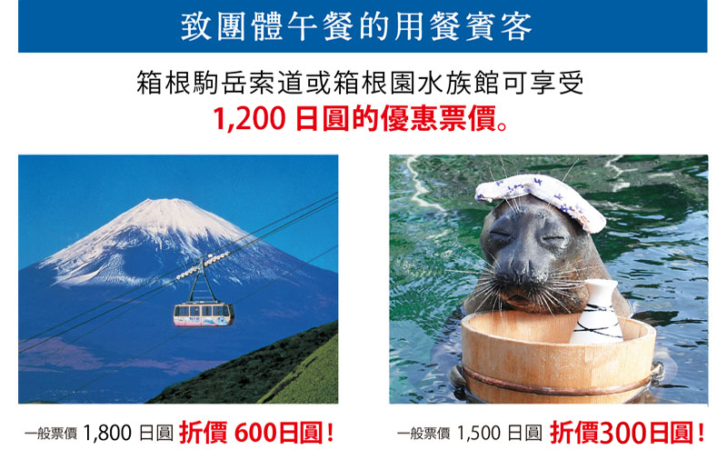 坐在湖畔特等席,欣賞著眼前一望無際的箱根蘆之湖美景,享受優雅的午餐時間。用餐前後還可去娛樂設施「箱根駒岳索道.箱根園水族館」遊玩,或是享受購物的樂趣。