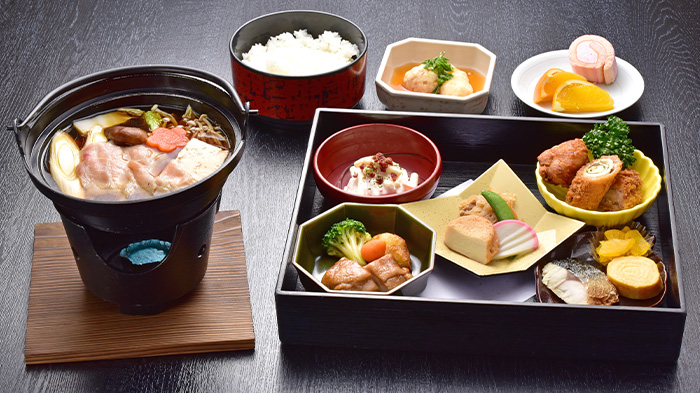 ・白身魚フライ・メンチカツ・鶏しんじょうと湯葉巻き 庵掛け・鶏ちゃんこ鍋(鶏つみれ・いなり)野菜 (白菜・長葱・椎茸・花人参)・白米・香の物・デザート