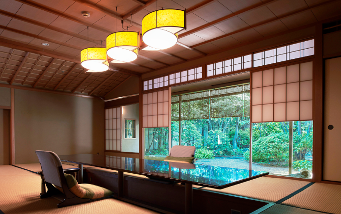 | This room evokes the poem “Tagasode” in the Kokinshu collection. The garden has a teahouse with a tranquil atmosphere. ●Available during night time. |