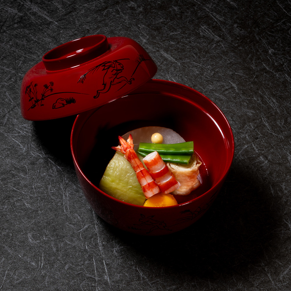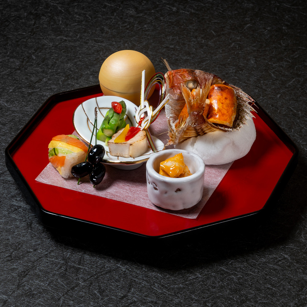 鯛・海老・数の子・昆布・黒豆・お赤飯・蛤のような厳選した縁起の良い食材を取り入れております。