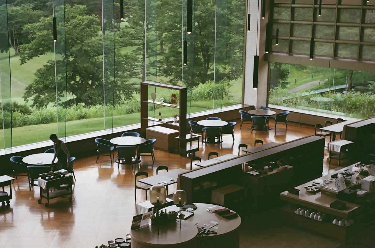この写真は、軽井沢の緑が映えるダイニング ブルームのディナー準備風景を、昭和20年代に輸入されたドイツ製のカメラで撮ったものです。