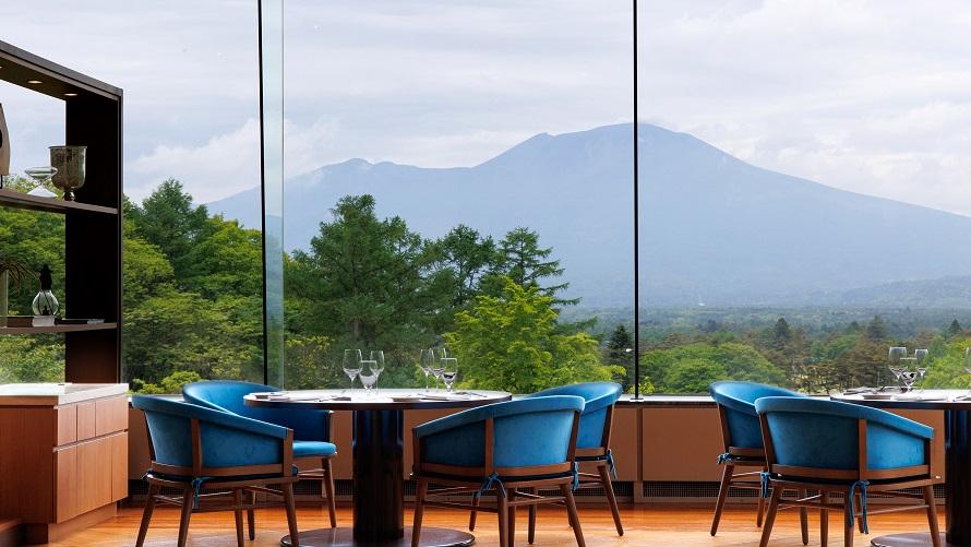 浅間山を望む景色を堪能しながら、信州の素材を使用した料理をお楽しみいただけるダイニング。