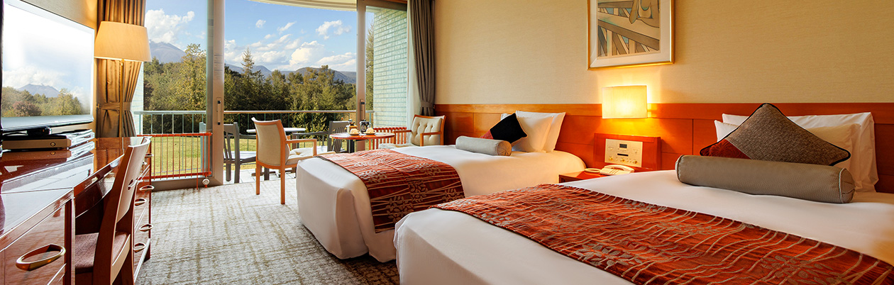 雄大な浅間山を望む軽井沢の四季折々の景色をお楽しみいただけるツインルーム。独立した洗面所、ゆったりとしたクローゼット。そして、女性にうれしい三面鏡のドレッサーなど心地よくご滞在いただけます。全てのお部屋に6.9㎡バルコニー付き。開放した窓から高原のさわやかな風を感じることができます。
