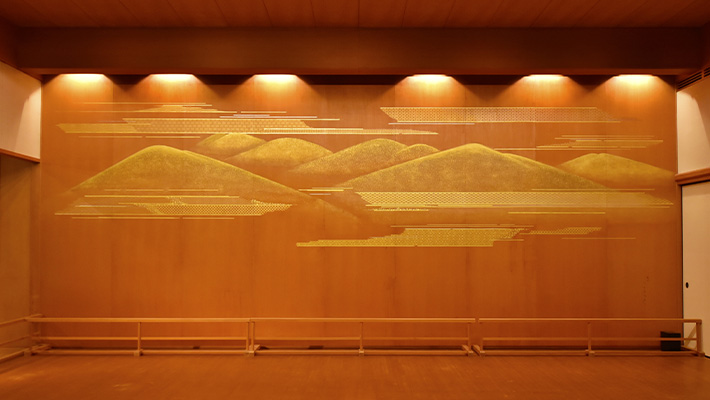 「文楽」の舞台となるのは、大広間「雄峰」。舞台正面には、截金作家・人間国宝 江里佐代子氏の大作『峰光』が展示され、雲海に浮かぶ山々を描いた繊細華麗な美しさが三養荘ならではの公演に華を添えます。