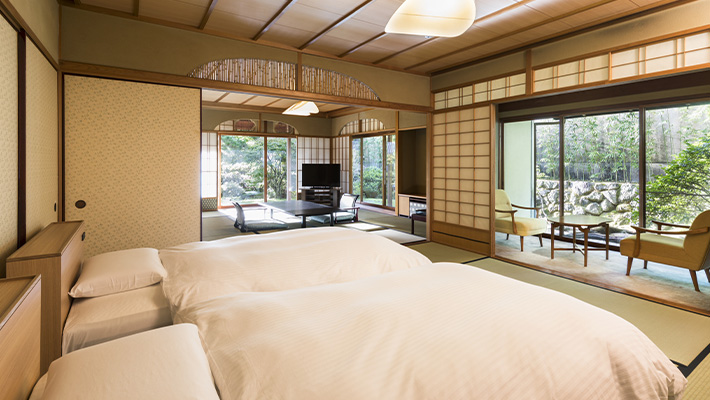 かけ流し温泉付きの客室や広大な日本庭園で寛ぎ、