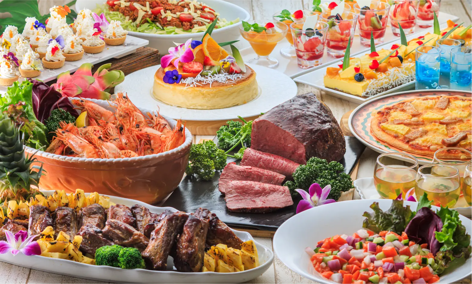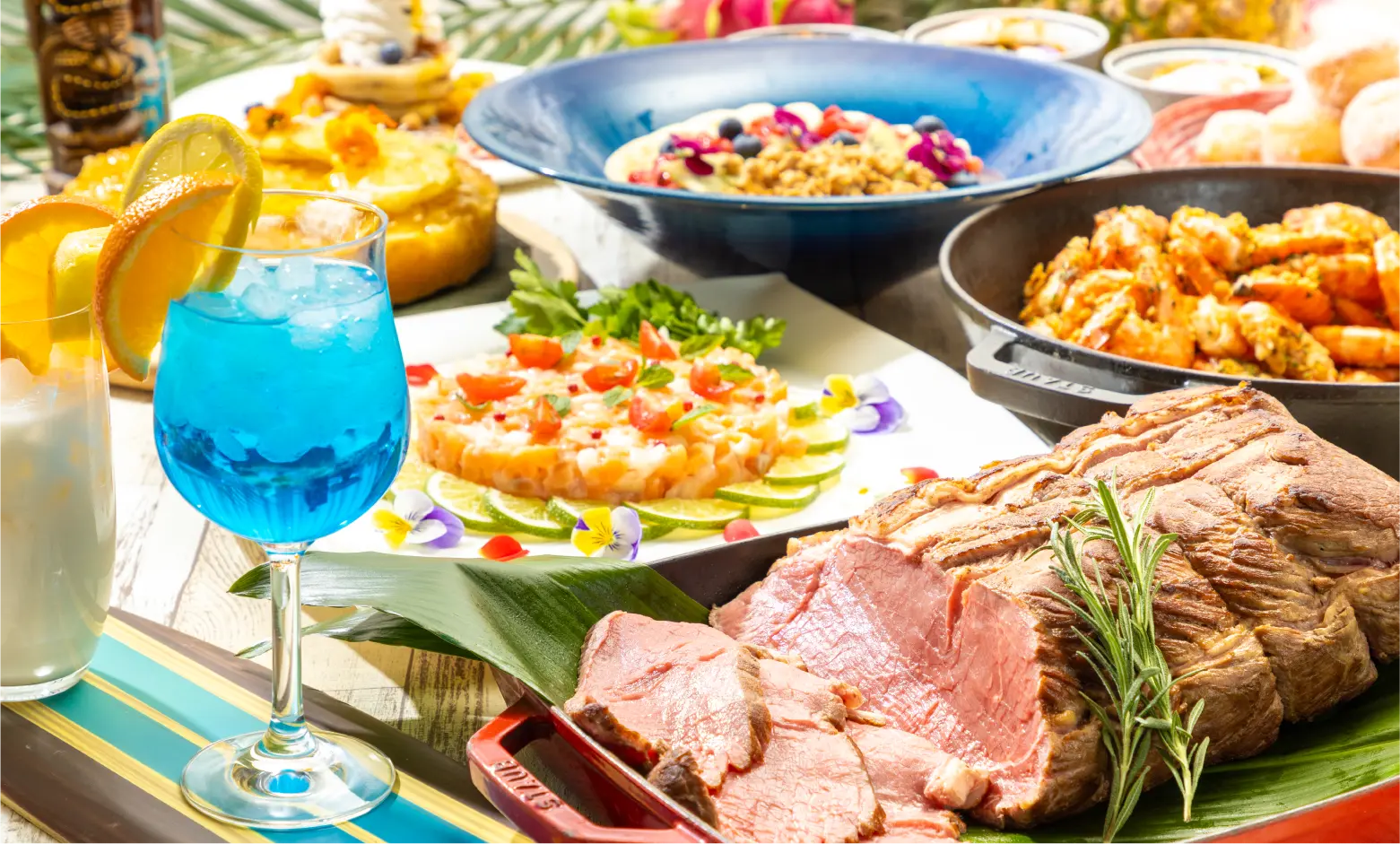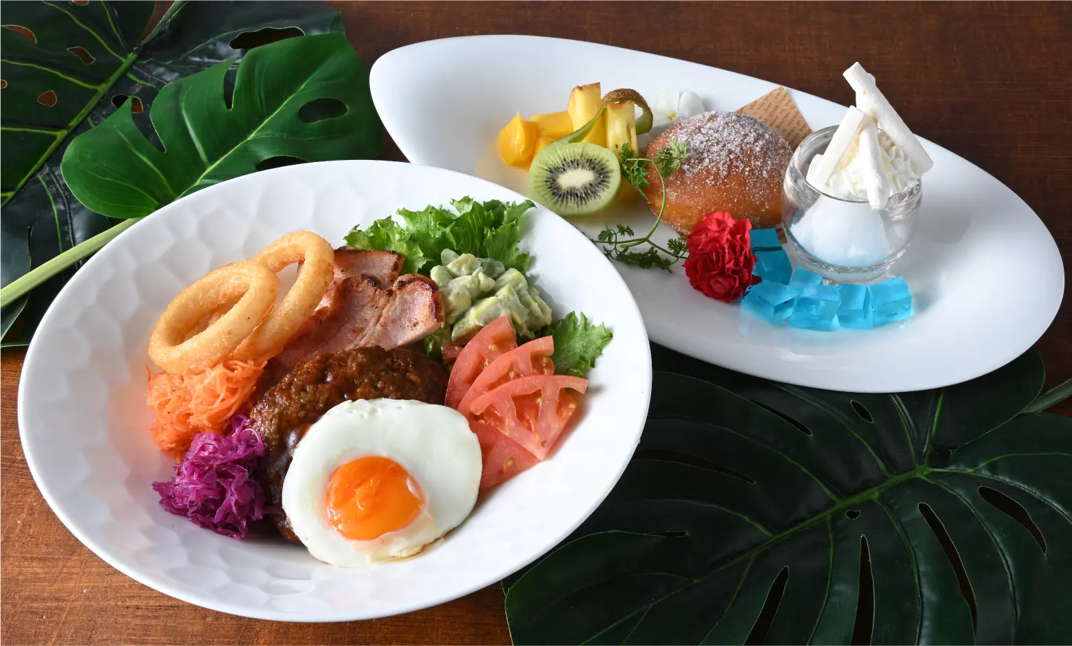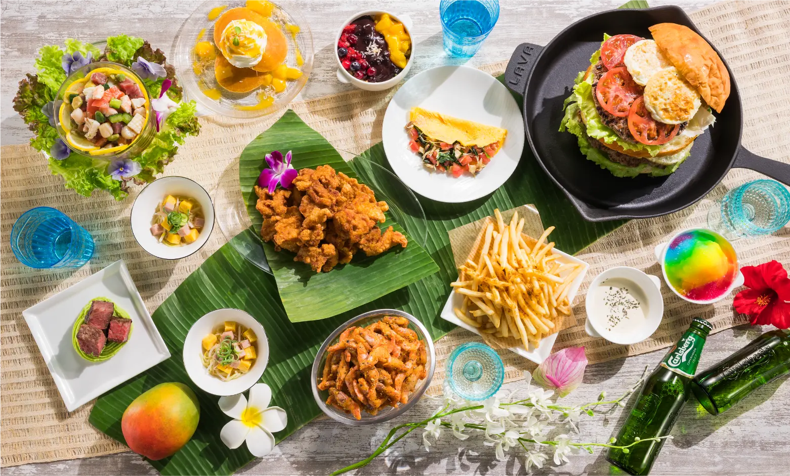 ランチには、あぐー豚煮込みハンバーグのミニバーガーや、香ばしいチキングリルフリフリソース、骨付きスペアリブなどボリューム満点のメニューが勢揃い。ディナーには、ハワイアンスタイルの魚料理や海の幸たっぷりのシーフードポキをご用意。デザートにはレインボーシフォンやマカダミアモンブランなど、見た目も華やかな南国スイーツが楽しめます。