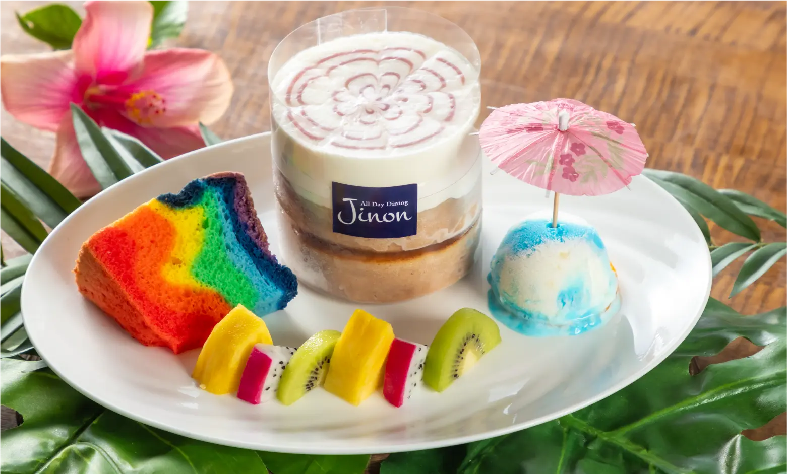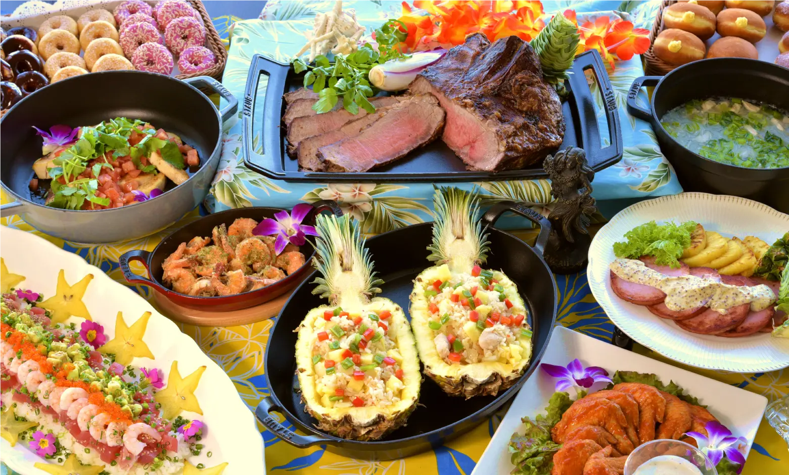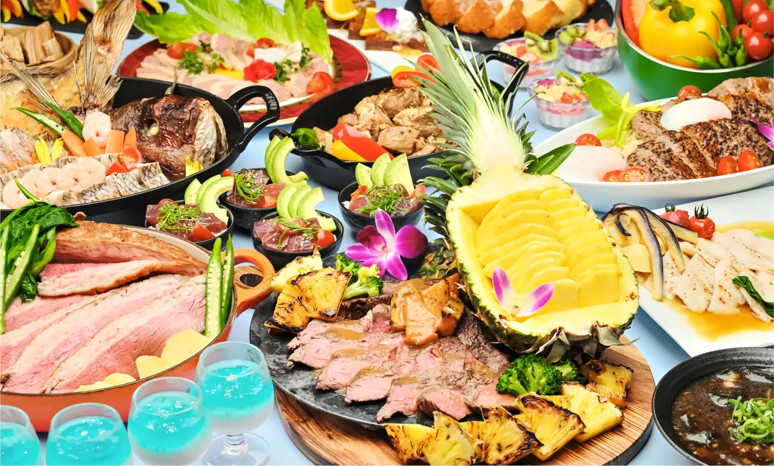 ランチには、あぐー豚煮込みハンバーグのミニバーガーや、香ばしいチキングリルフリフリソース、骨付きスペアリブなどボリューム満点のメニューが勢揃い。ディナーには、ハワイアンスタイルの魚料理や海の幸たっぷりのシーフードポキをご用意。デザートにはレインボーシフォンやマカダミアモンブランなど、見た目も華やかな南国スイーツが楽しめます。