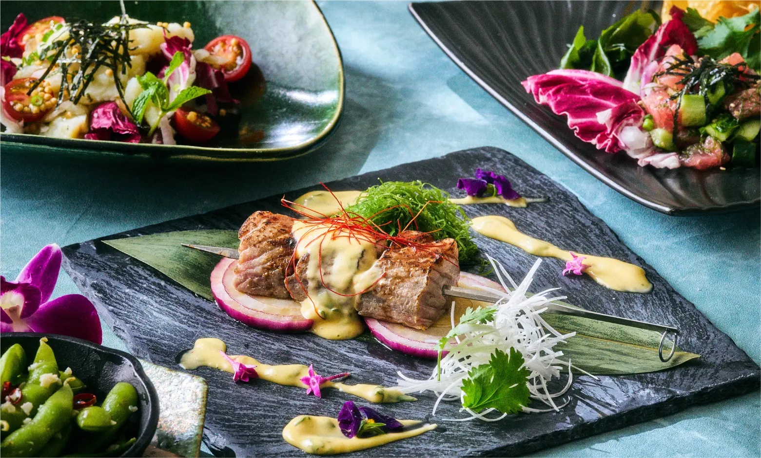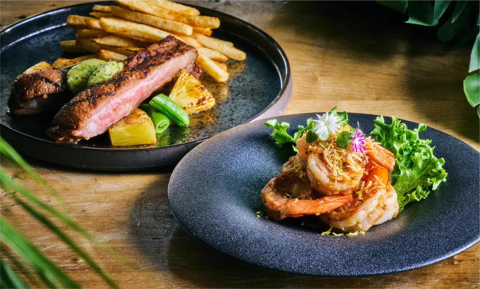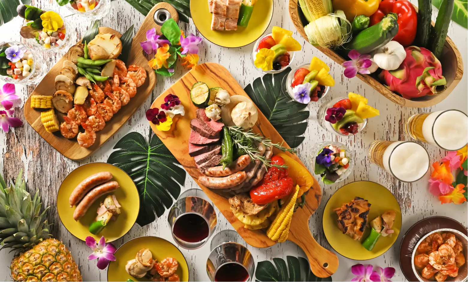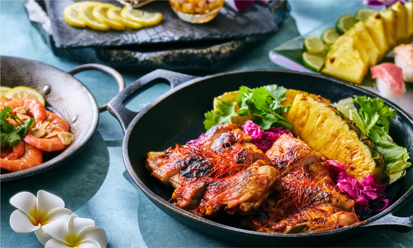 ランチには、あぐー豚煮込みハンバーグのミニバーガーや、香ばしいチキングリルフリフリソース、骨付きスペアリブなどボリューム満点のメニューが勢揃い。ディナーには、ハワイアンスタイルの魚料理や海の幸たっぷりのシーフードポキをご用意。デザートにはレインボーシフォンやマカダミアモンブランなど、見た目も華やかな南国スイーツが楽しめます。