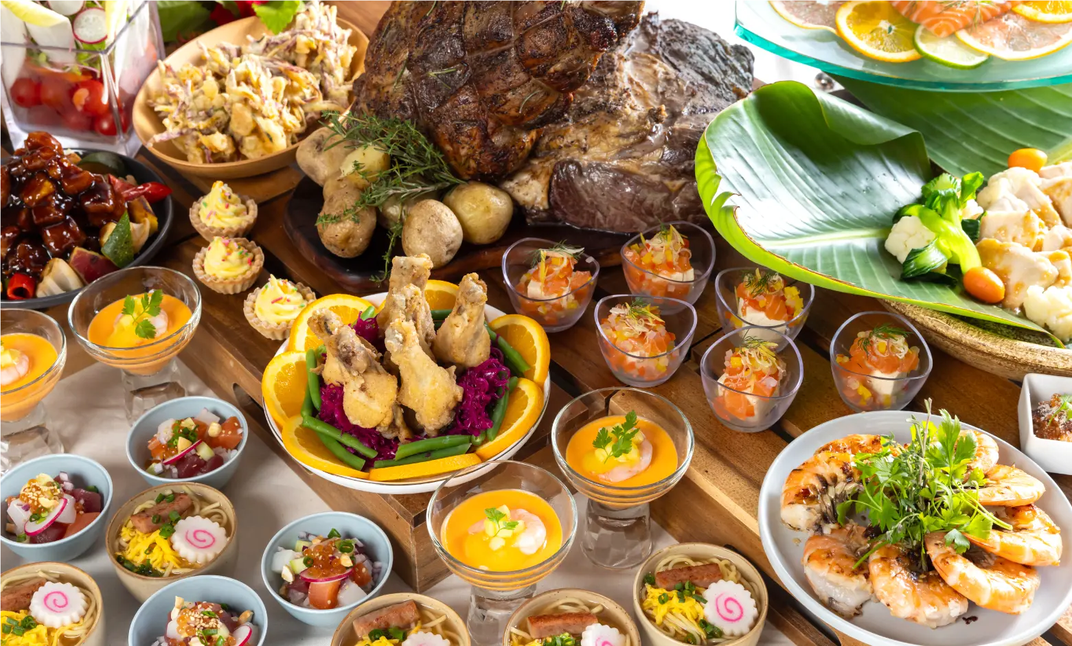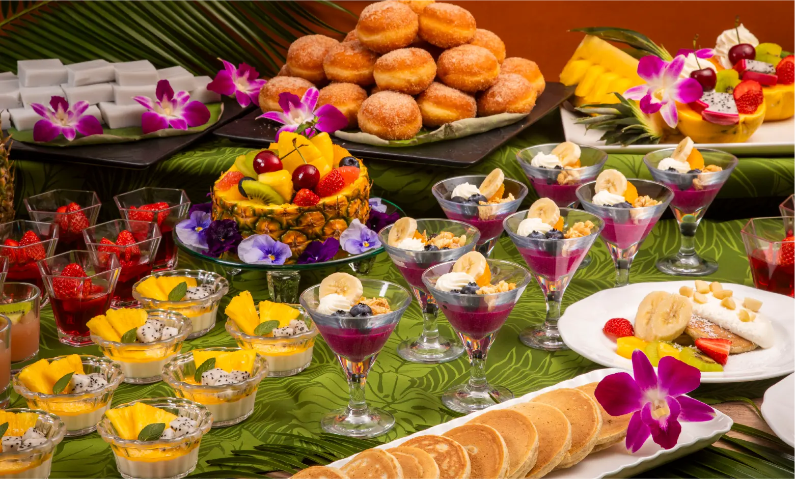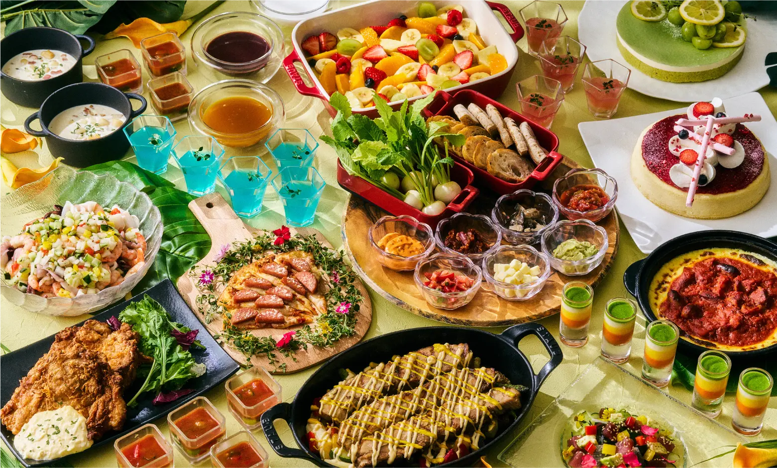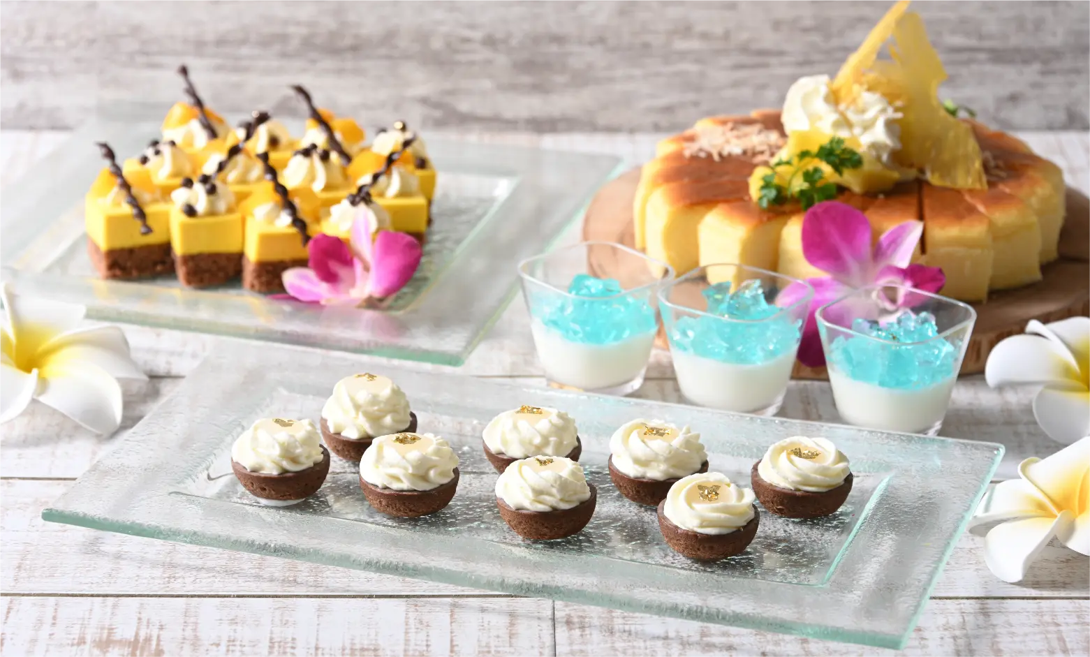 シェフがお客さまの目の前で仕上げる天ぷらや寿司、スパイスと青山椒の香りを感じるメニューなどを食べ放題でお楽しみいただけます。 7月から登場するココナッツタルトやブルーハワイジュレを添えたパンナコッタなど、南国の風が香るハワイアンデザートを心ゆくまでご堪能ください。