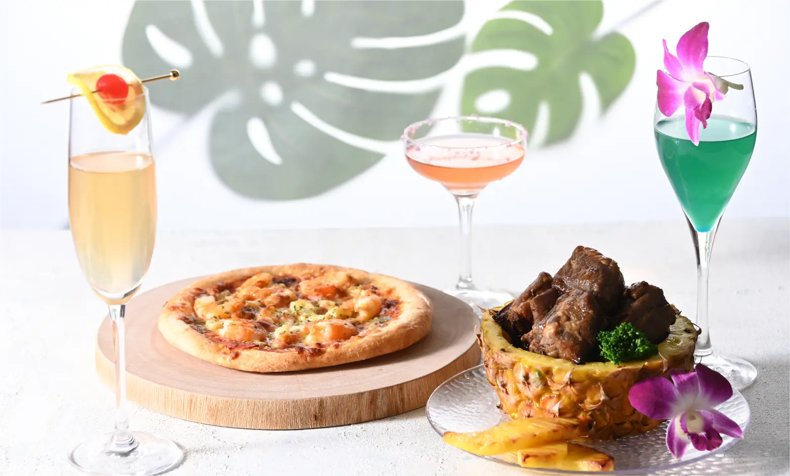 爽やかなトロピカルカクテルとハワイアンメニュー2種をご用意。ハワイを連想させる色合いと芳醇なぶどうがリゾート気分を演出するカクテルや、ハワイで人気のガーリックシュリンプがトッピングされたピザなど、ハワイ気分を味わえるメニューでおとなな夏の時間をお過ごしください。