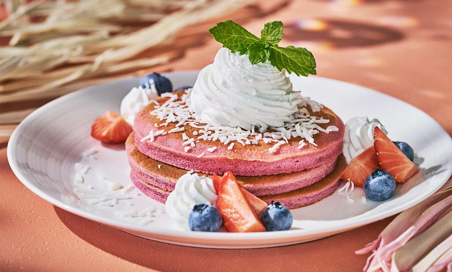 レインボーカラーに焼き上げた見た目も楽しいふわっとした食感のカラフルシフォンケーキとパンケーキとのマリアージュをお楽しみください。