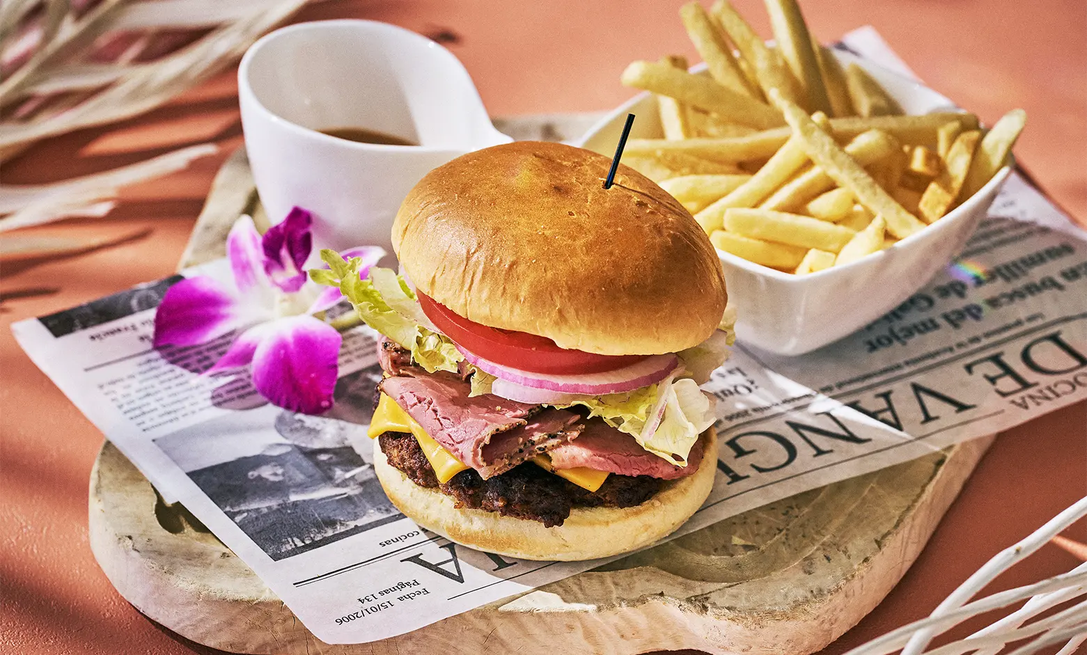 ピンクパレスソースを使用し、ロイヤルハワイアンスタイルにアレンジした黒毛和牛バーガーをお楽しみいただけます。