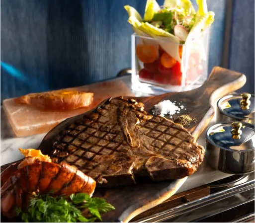 アメリカ産Tボーンステーキ、スパイシーロブスター、岩塩と炭火香るサーモンマリネのレアステーキを贅沢に盛り合わせた逸品。