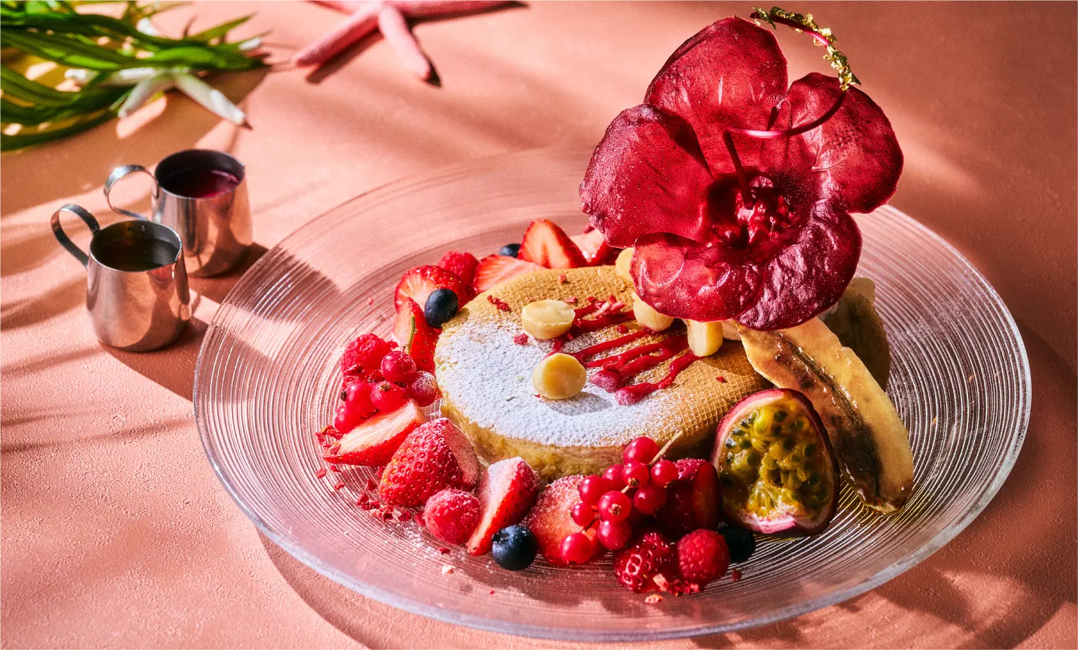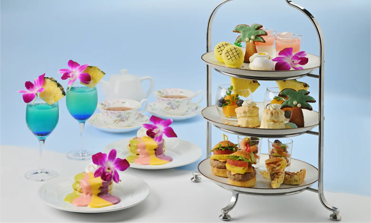 ハワイの美しい情景をイメージしたフォトジェニックなアフタヌーンティー。鮮やかな色合いの「レインボーパンケーキ」やハワイの名物ハンバーガーをひと口サイズにした「ハワイアンハンバーガー」など、夏にぴったりなメニューをお楽しみください。
