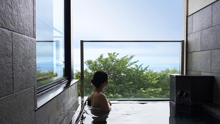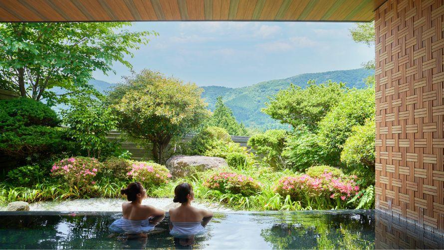 女性露天風呂『胡蝶』から眼下に芦ノ湖、遠くに富士山を望む絶景