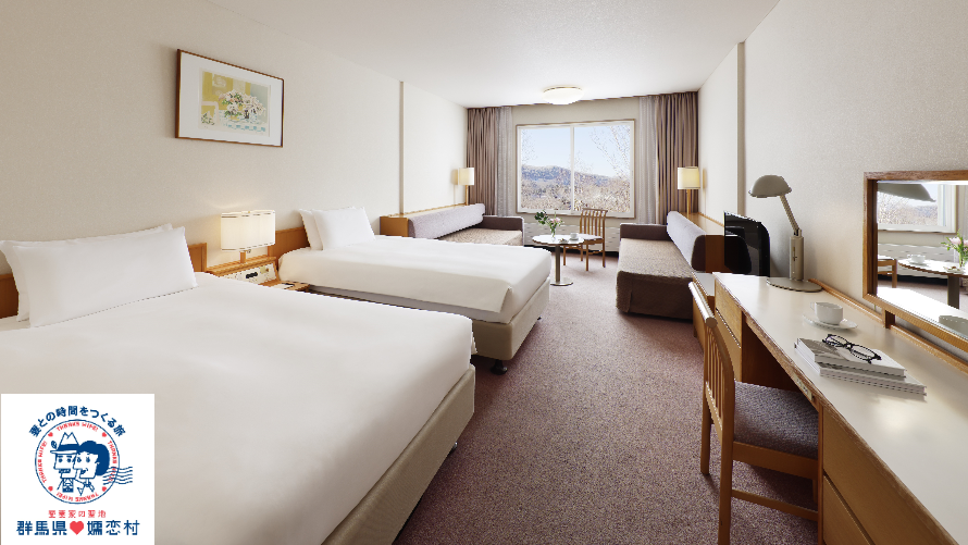 函館大沼プリンスホテルの スーペリアツインフォレストサイドの部屋の中と大沼ビール