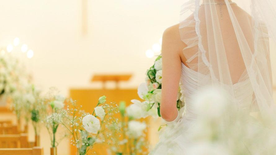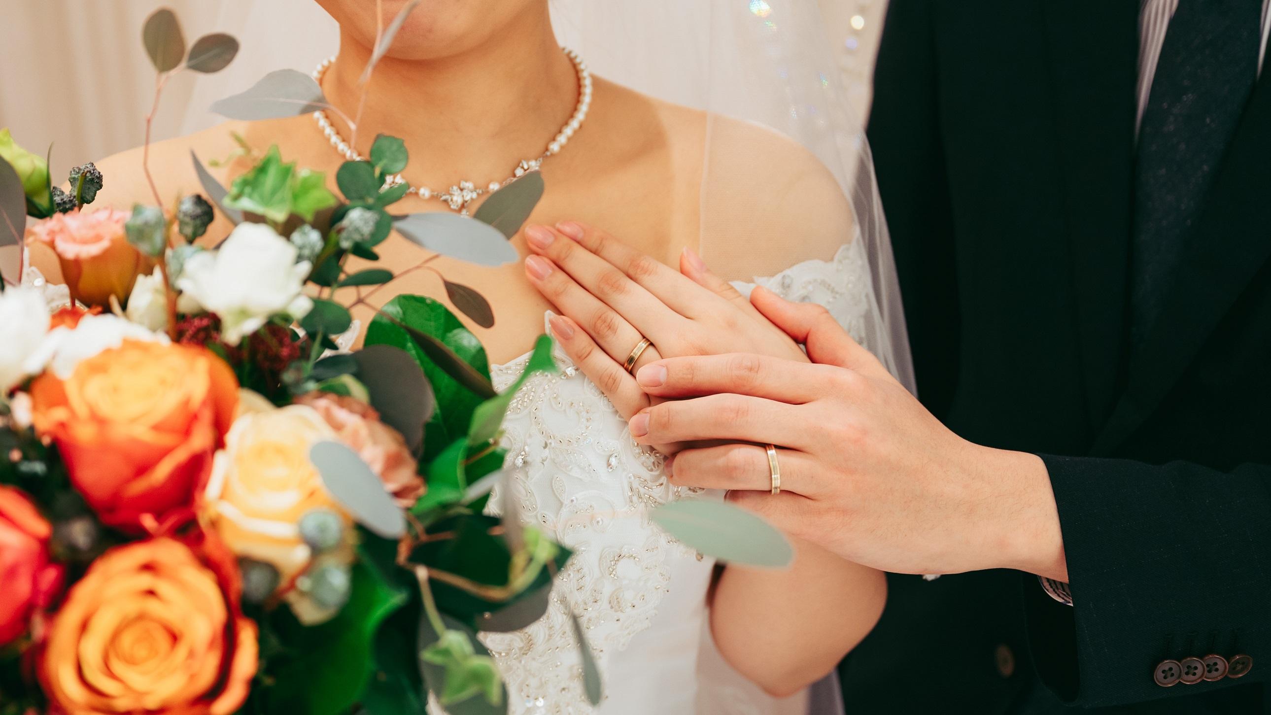 結婚式をあげた新郎新婦。新婦が新郎の腕に手をかけている。