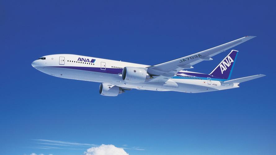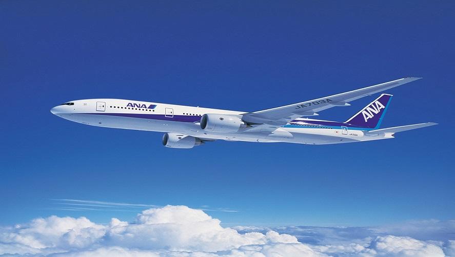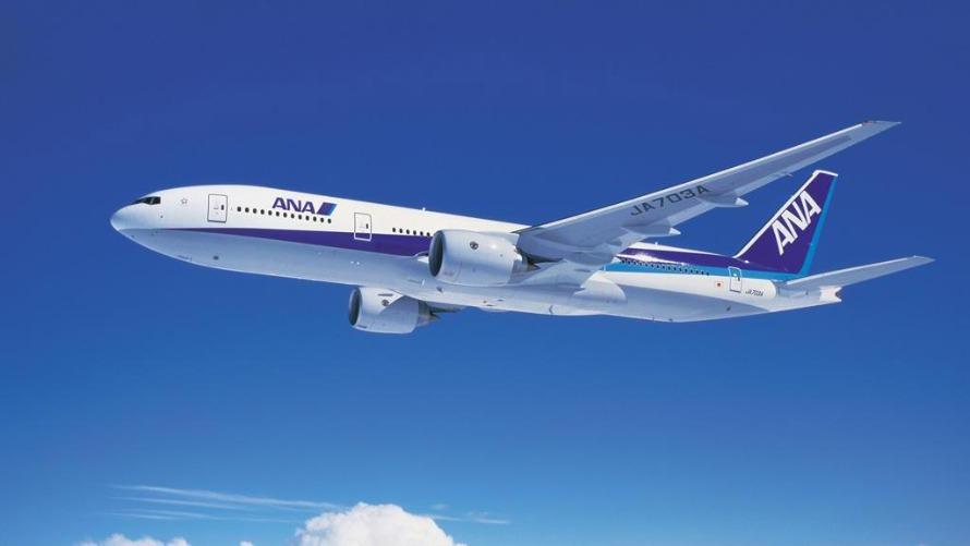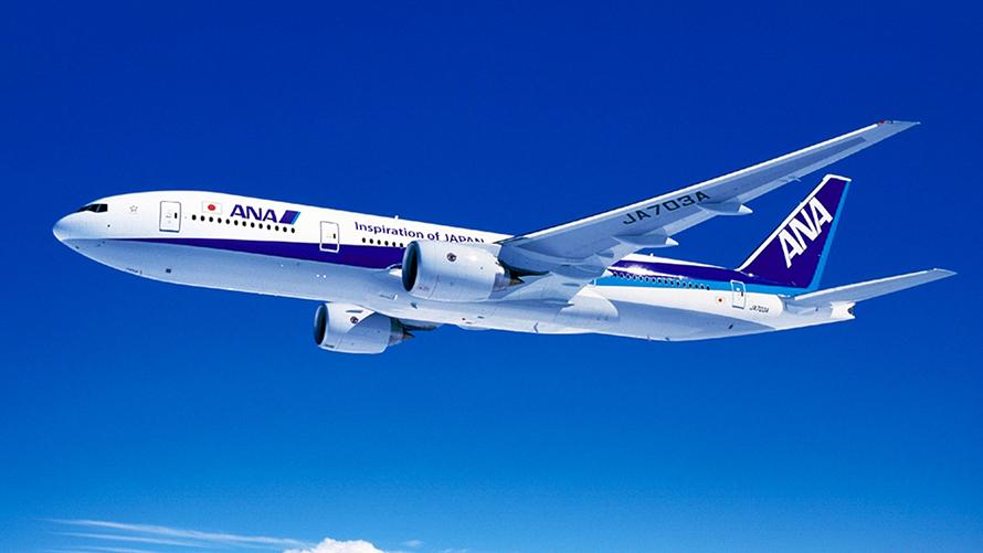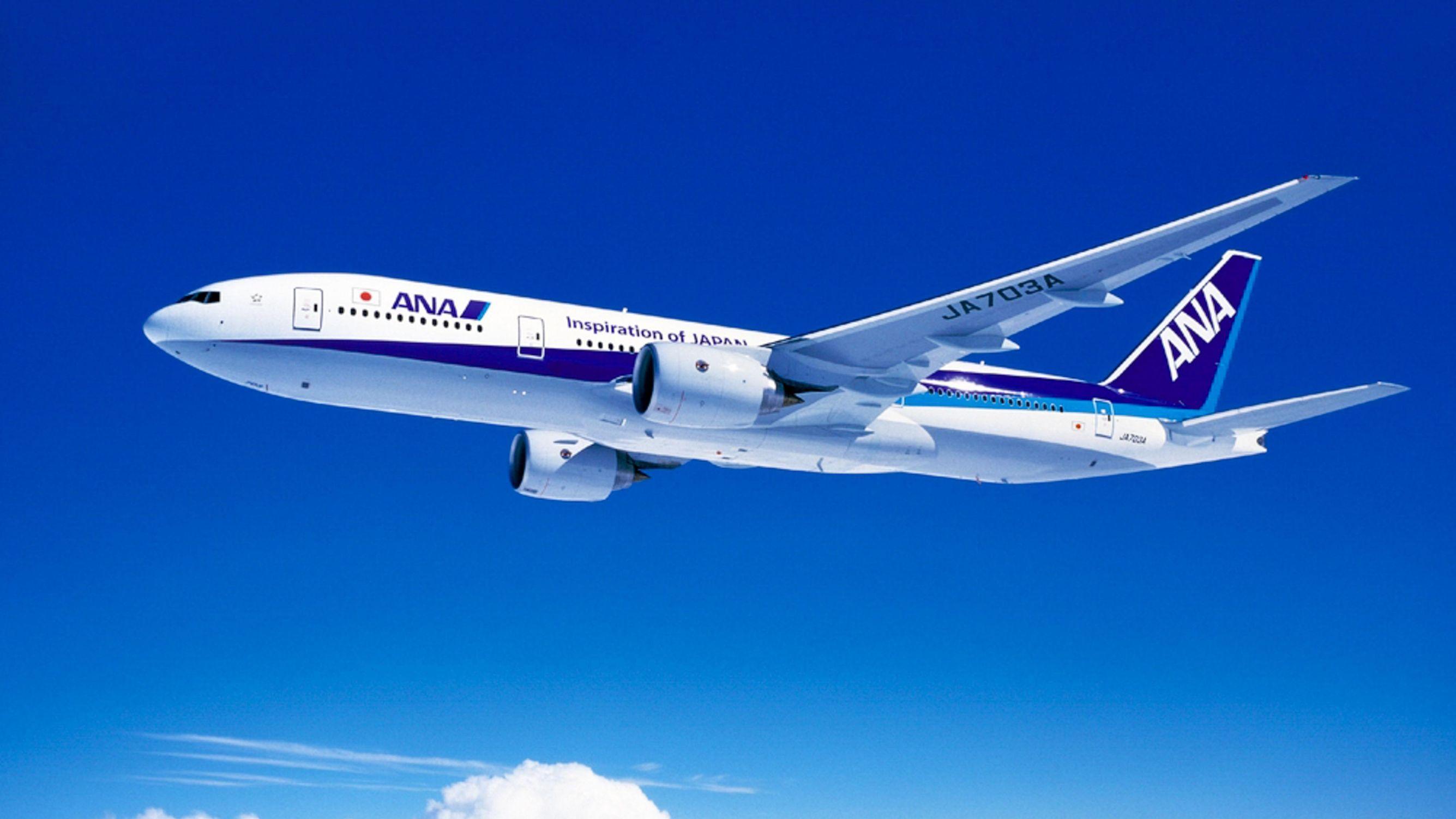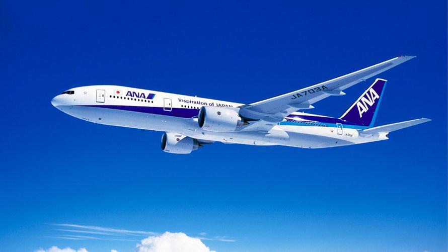 美しい青空を背景に飛行するANA旅客機のイメージ。