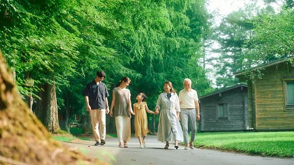 ヴィラのテラスで楽しそうに過ごす三世代ファミリー