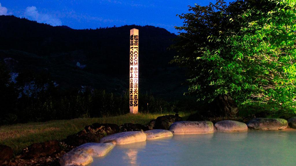 ライトアップされた夜の露天風呂「こまくさの湯」の景色