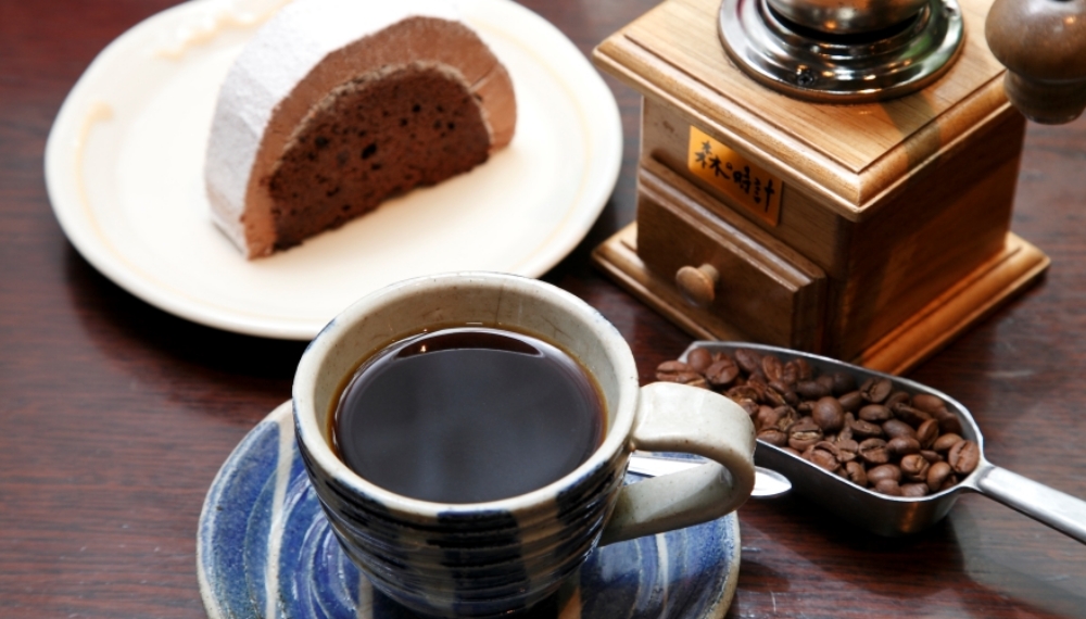 木立の中にひっそりとたたずむ「珈琲 森の時計」。カウンター席では、自分でミルを使って挽いた珈琲豆で珈琲を淹れることができます。脚本家・倉本聰氏のドラマ「優しい時間」の舞台にもなったカフェで、香ばしい豆の香りが漂う。