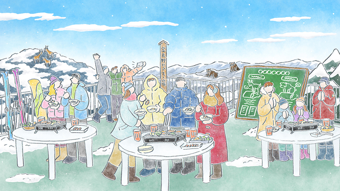 使用するのは、ジンギスカンなど北海道ならではの食材のほか、害獣として処理される運命にあった鹿肉です。北海道では年間約15万頭にも上る鹿が駆除され、そのほとんどが廃棄されています。この鹿肉をジビエとして有効活用する取り組みが山賊BBQ。おいしくて食育にもなる体験です。十勝岳連峰と白銀のゲレンデを見渡せる「パノラマデッキ900」でお楽しみください。