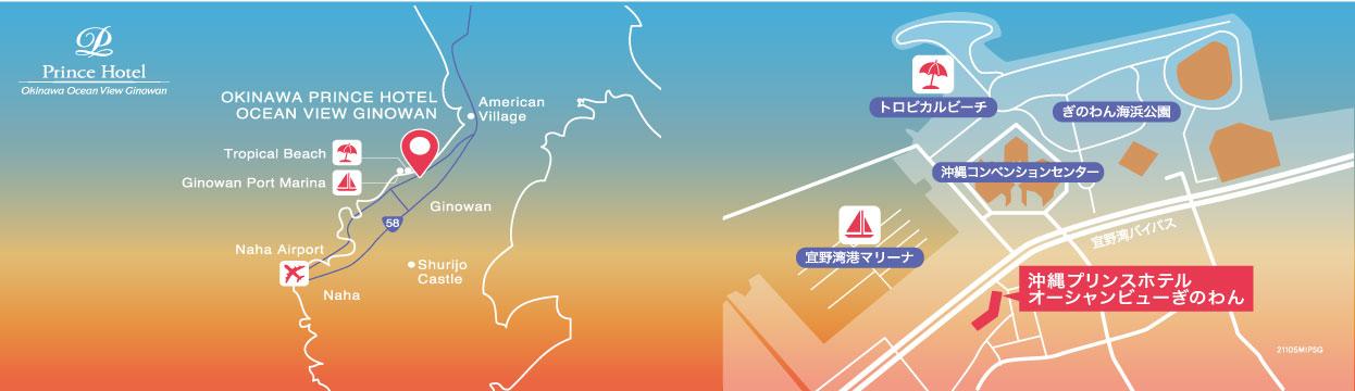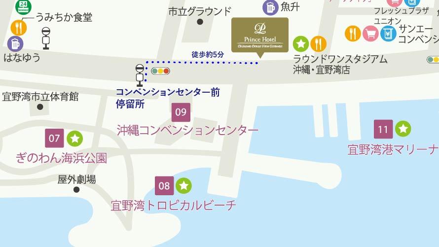 路線名/駅名 所要時間 【32】コンベンションセンター線[沖縄バス] 「コンベンションセンター前」下車 約50分 【43】北谷線[沖縄バス] 「コンベンションセンター前」下車 約50分 コンベンションセンター前、降車後ホテルまで約500m 徒歩約5分