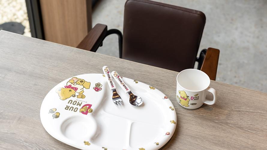 お子さま向けハイチェア(ベルトなし)や食器もご用意しております。
