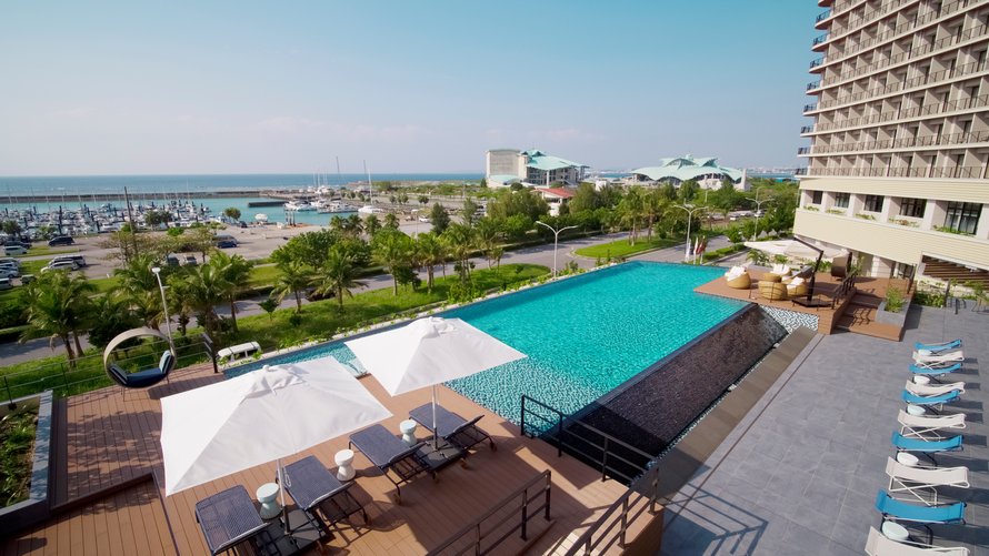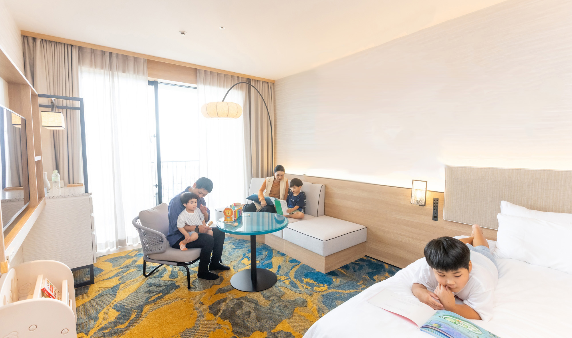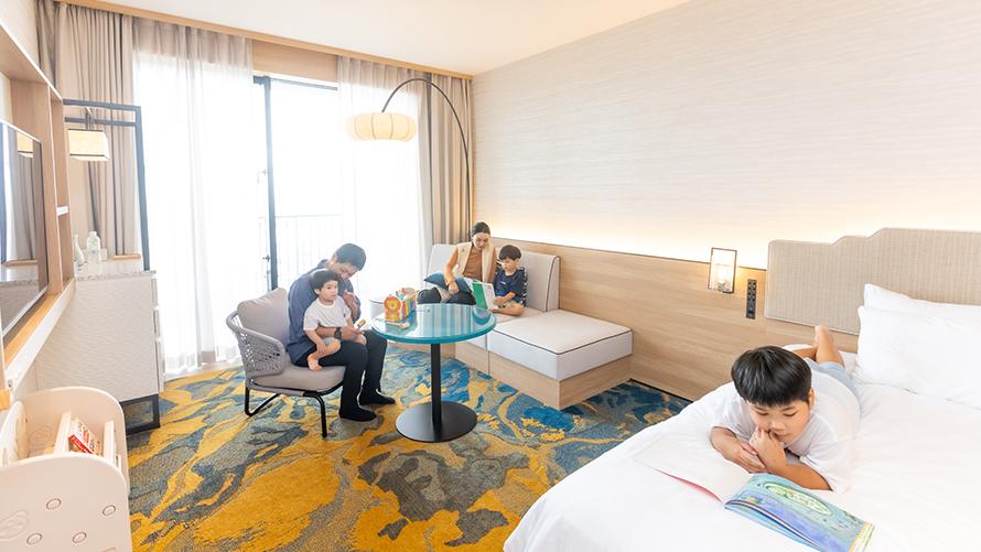 ぎのわん海浜公園(宜野湾トロピカルビーチ)まで徒歩圏内、アメリカンビレッジまでも車で約10分など観光に最適なホテルです。認定客室は青い海や夕陽など時間によって様々な海を望むことができる、セパレートタイプのバスルーム付きツインルーム。おもちゃや絵本が常備されており、お子さまと一緒にゆったりと過ごすことができます。