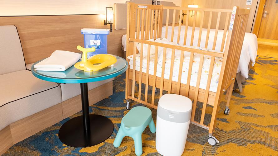ベビーベッド/ベッドガード/おねしょマット/お子さま用便座/おむつゴミ箱/ステップ台/ベビーバス/館内用ベビーカー/哺乳瓶洗浄機