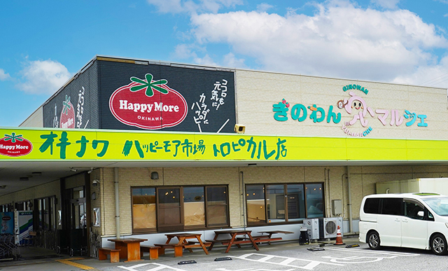 宜野湾市の宜野湾新漁港近くにある、農産物直売所「ハッピーモア市場」と「食堂」が入った施設です。那覇空港などのお土産店では揃わない産直品も多く取り揃えています。