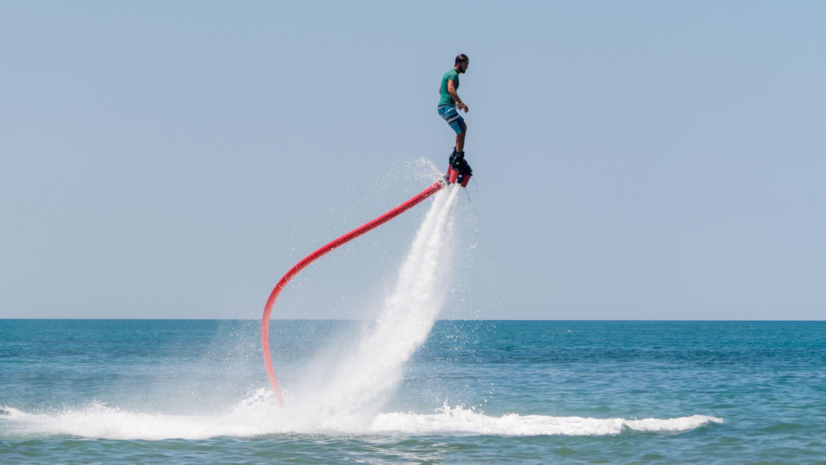 足元から噴射される強力な水圧で、まるで空を飛んでいるような浮遊体験ができるフライボード。