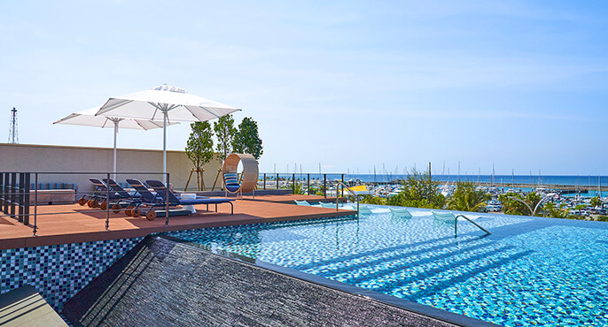 一年中、泳げて海との一体感が楽しめます。クラブフロアご宿泊者さま専用のインフィニティプールです。
