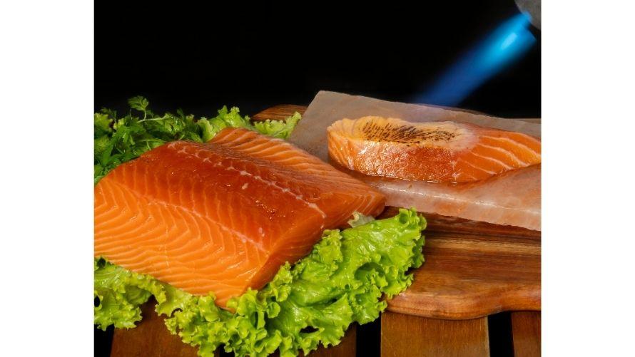 沖縄県伊平屋島産黒糖でマリネしたノルウェーサーモンを岩塩プレートを用い、炭火バーナーで仕上げ、シークヮーサーの香るドレッシングで合わせました。