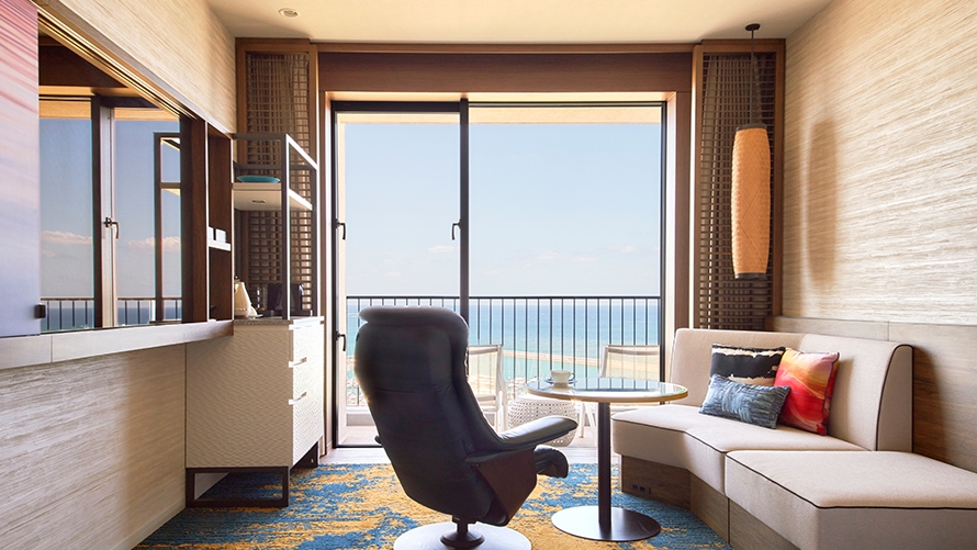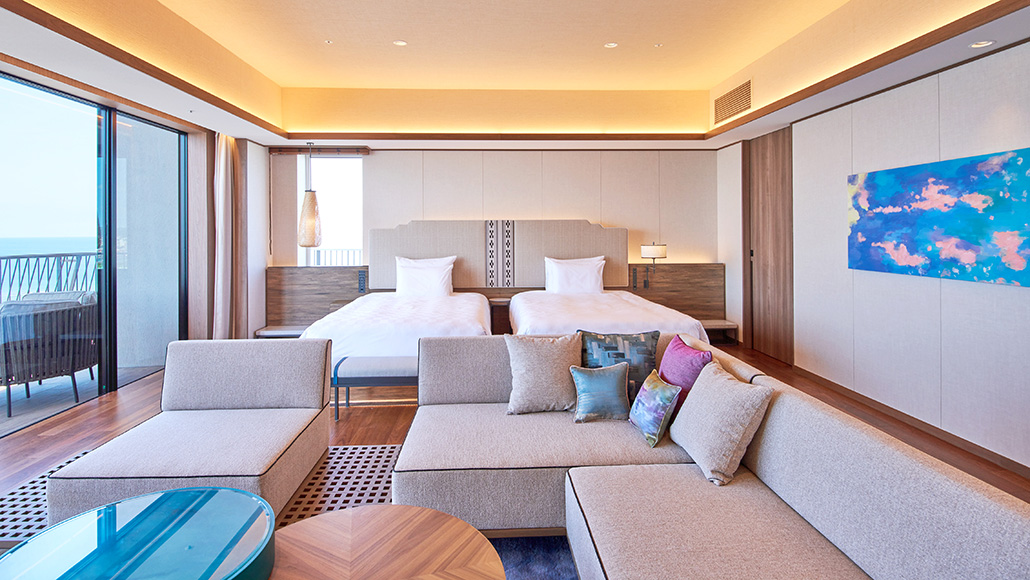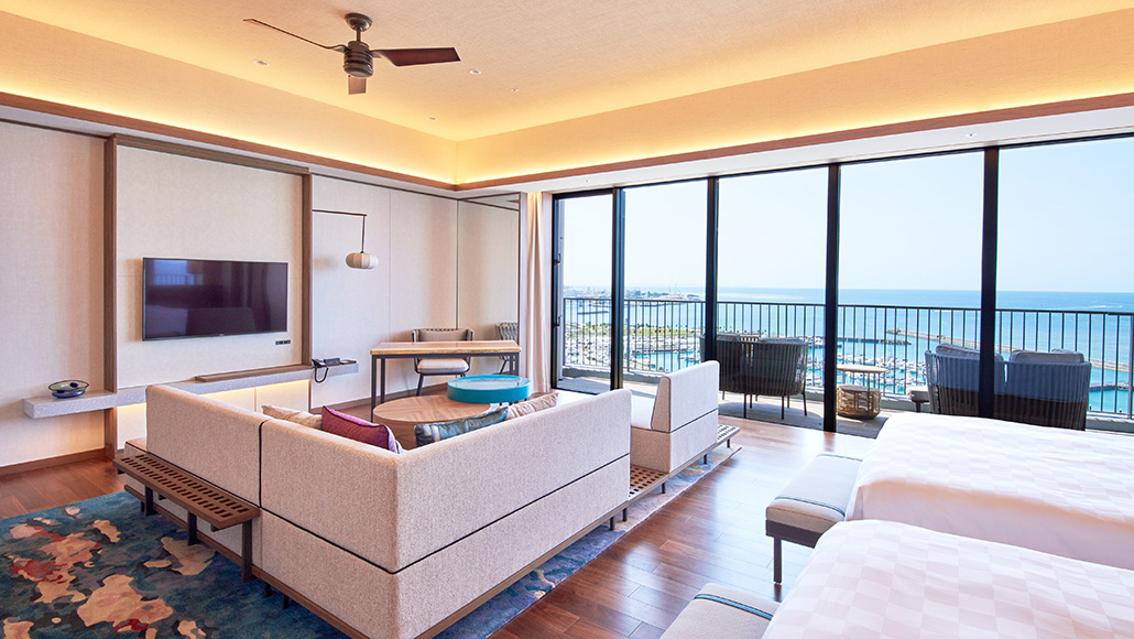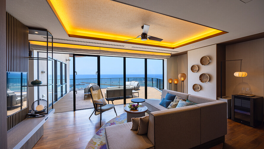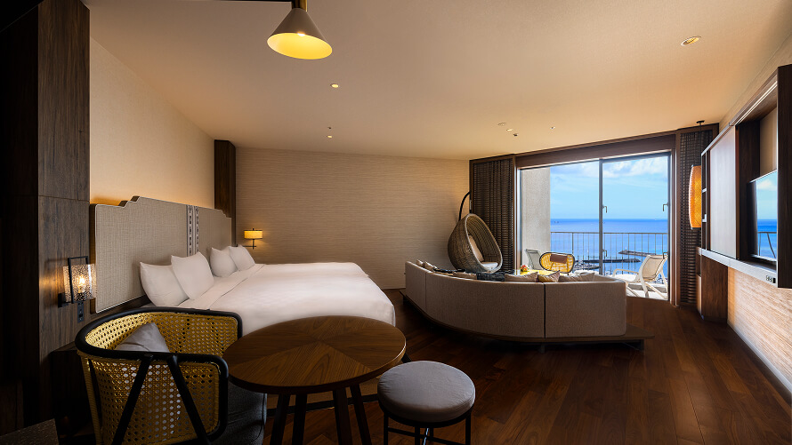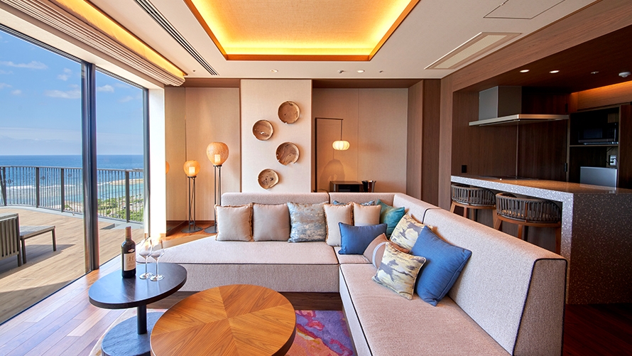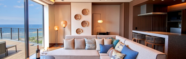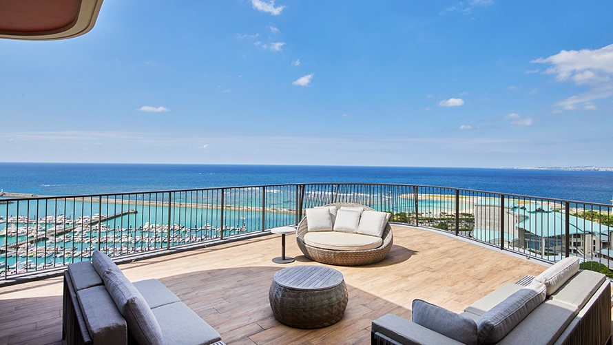 ホテル最上階に位置する70㎡のテラスを備えた解放感あふれるスイートルームです。遮るもののない絶景と海風(ウミカジ)を心ゆくまでご堪能ください。