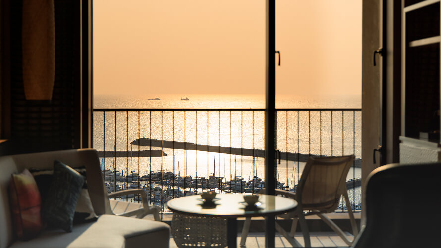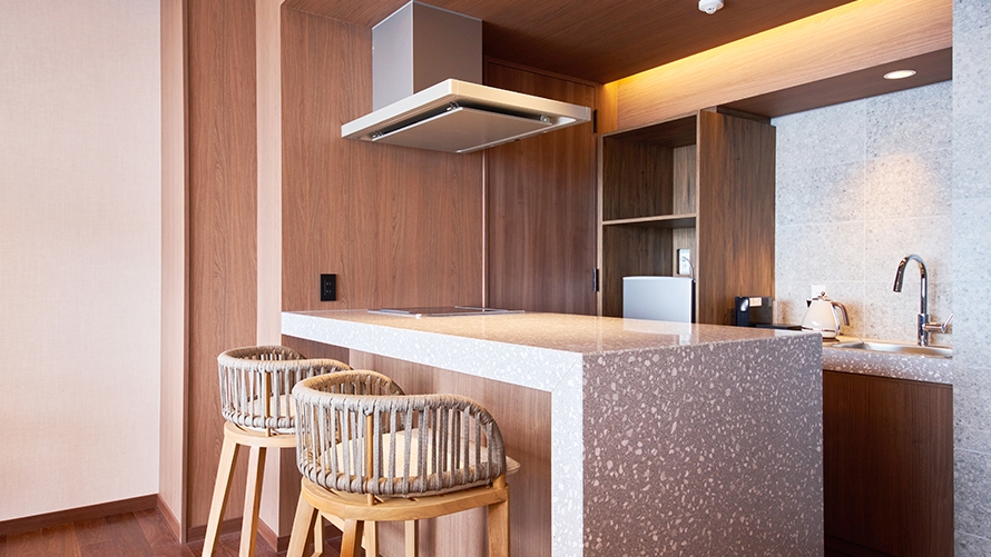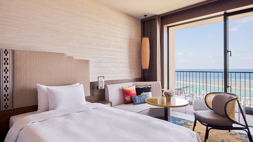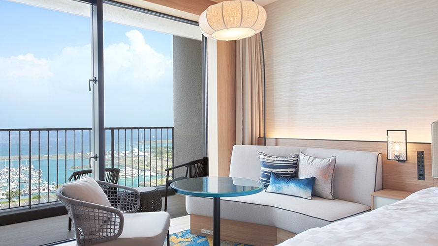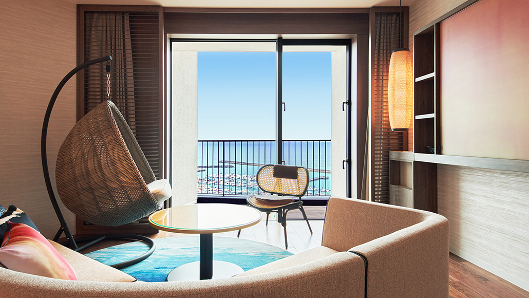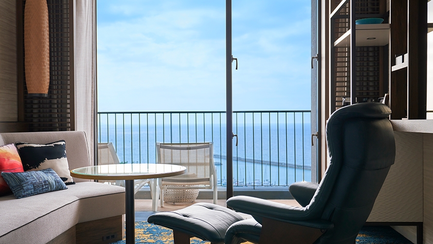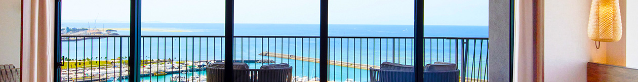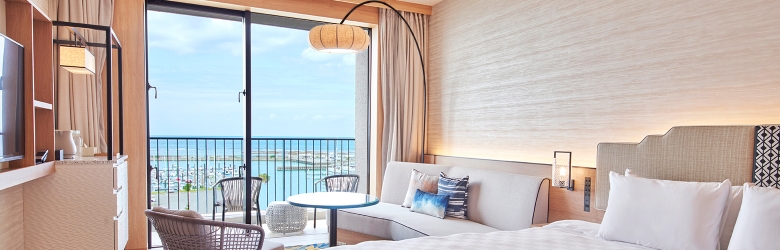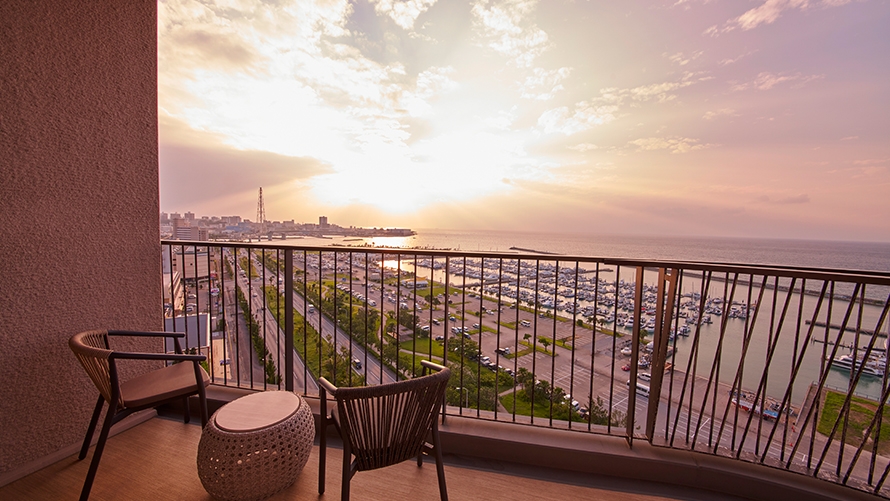 ホテル最上階に位置する70㎡のテラスを備えた解放感あふれるスイートルームです。遮るもののない絶景と海風(ウミカジ)を心ゆくまでご堪能ください。