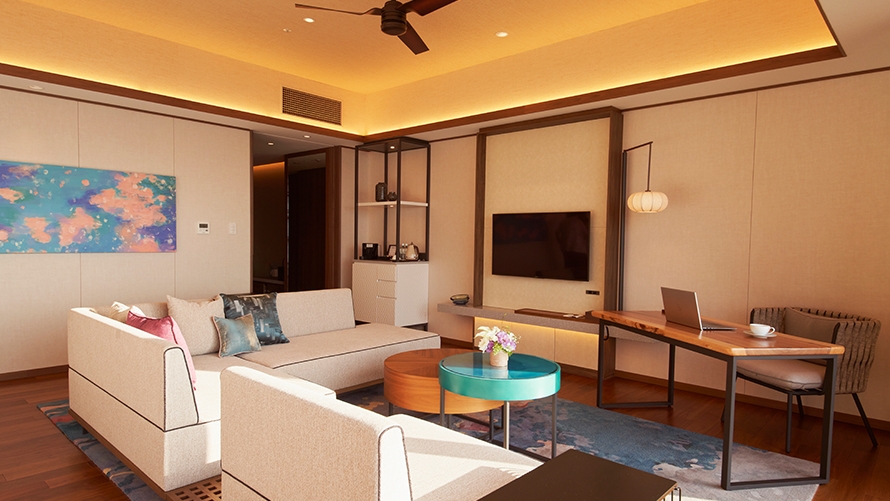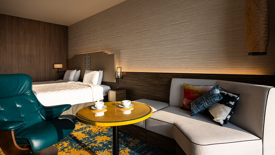 スーペリアフロア10・11Fに位置する50㎡の、上質なしつらえの客室。雄大な景色とさわやかな風を存分にお楽しみください。