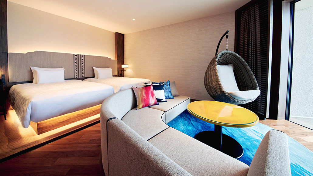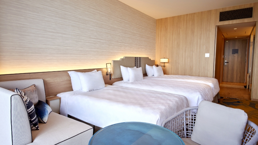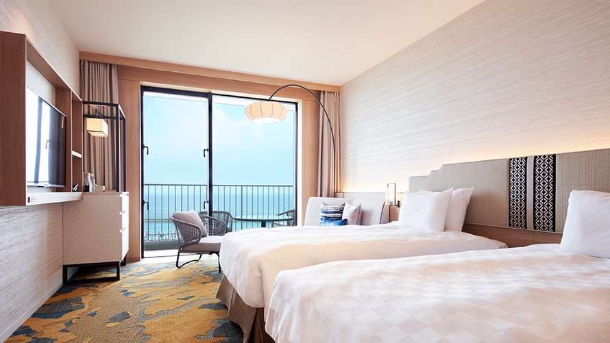 上質なしつらえと雄大な水平線を心ゆくまでご堪能ください。面積:37.7㎡/ベッドサイズ:幅120cm×長さ206cm 2台/定員:1〜2名