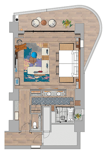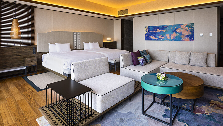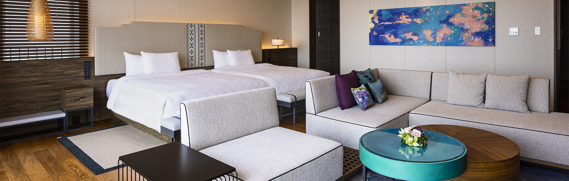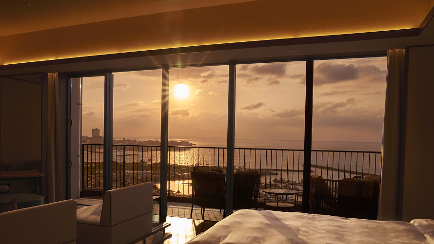 70㎡のフロアに25㎡のテラスを備えた、ジュニアスイートタイプの13階北側。客室とテラスの一体感が織りなす解放感あふれる空間をお楽しみください。