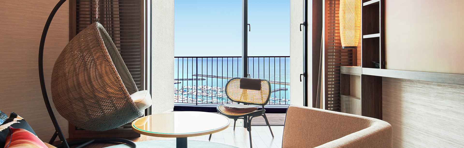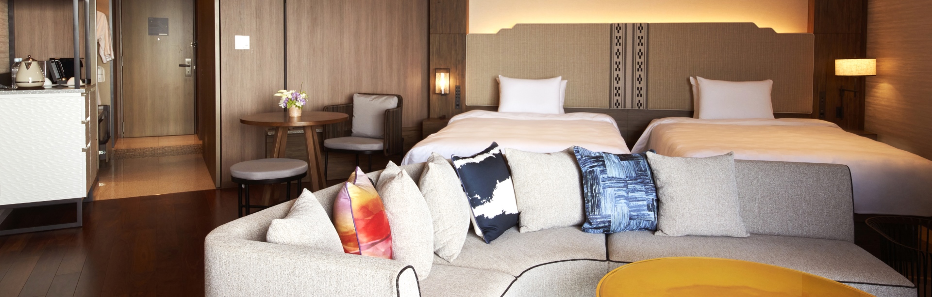 スーペリアフロア10・11Fに位置する50㎡の、上質なしつらえの客室。雄大な景色とさわやかな風を存分にお楽しみください。