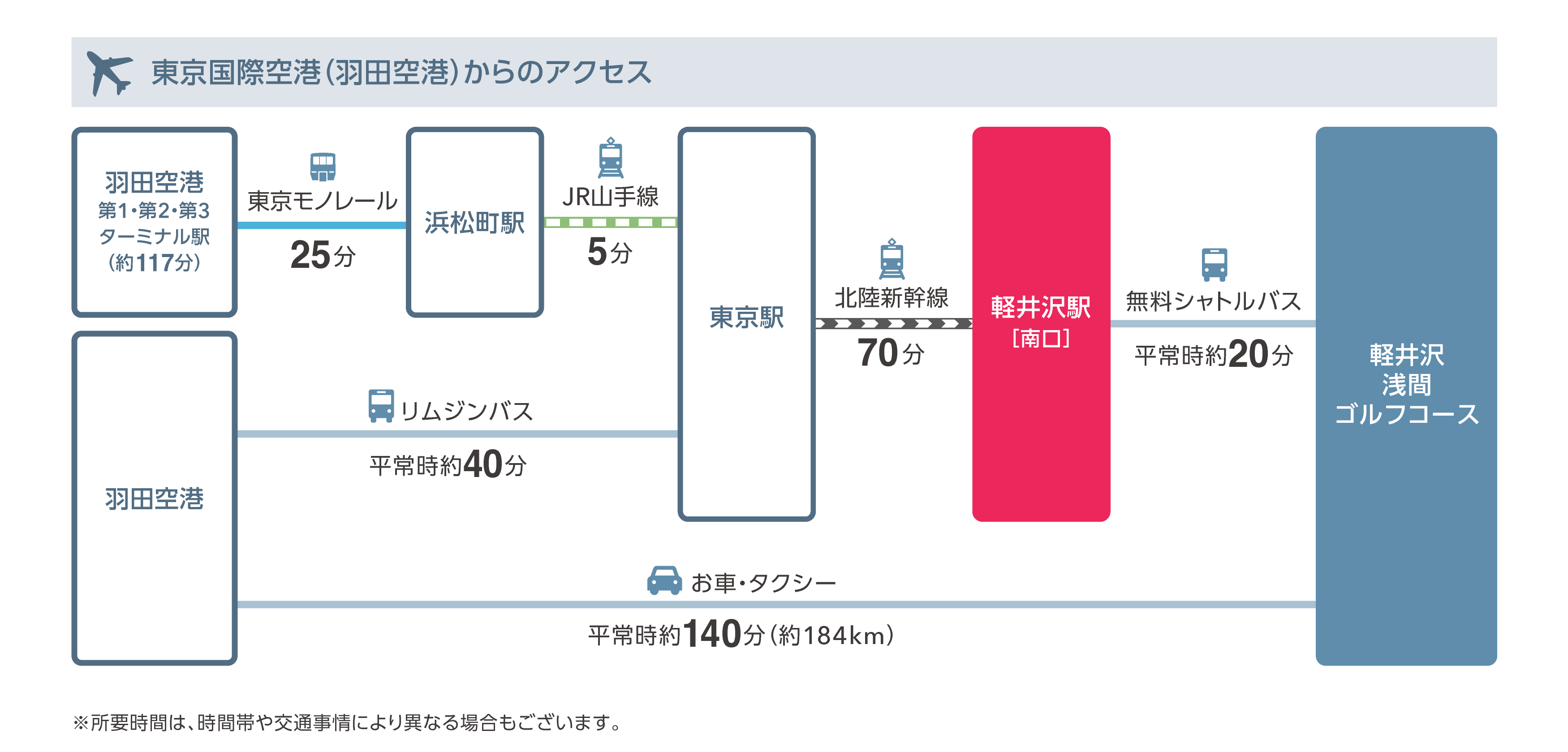 北陸新幹線 軽井沢駅南口より無料シャトルバスを運行。