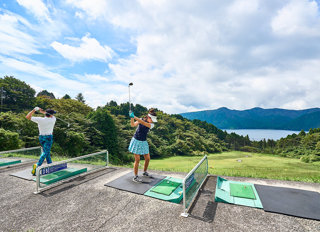 自然豊かな景色の中、芦ノ湖に向かって打つショットは爽快感抜群。