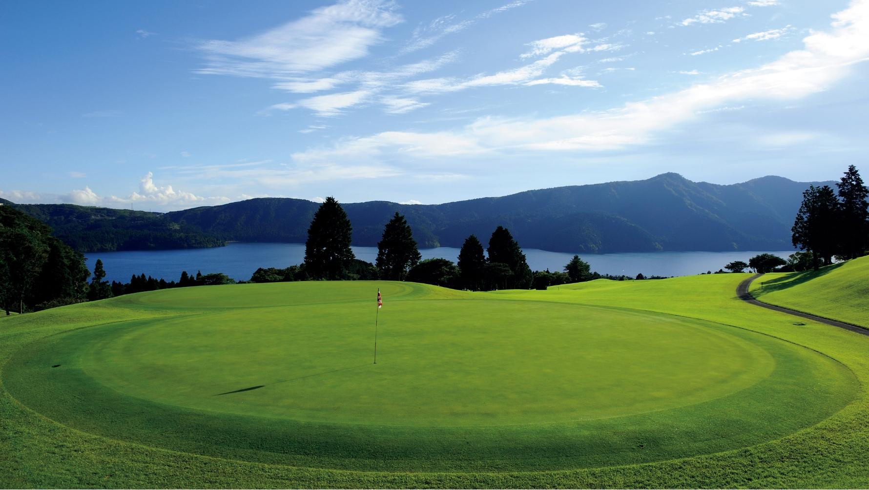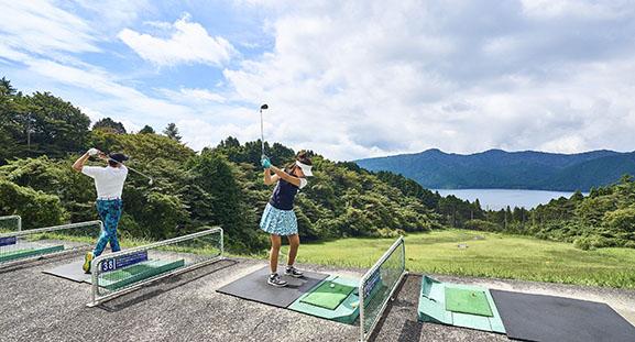 芦ノ湖にむかって打つ景色抜群の練習場。ラウンド前後の調整にどうぞ。