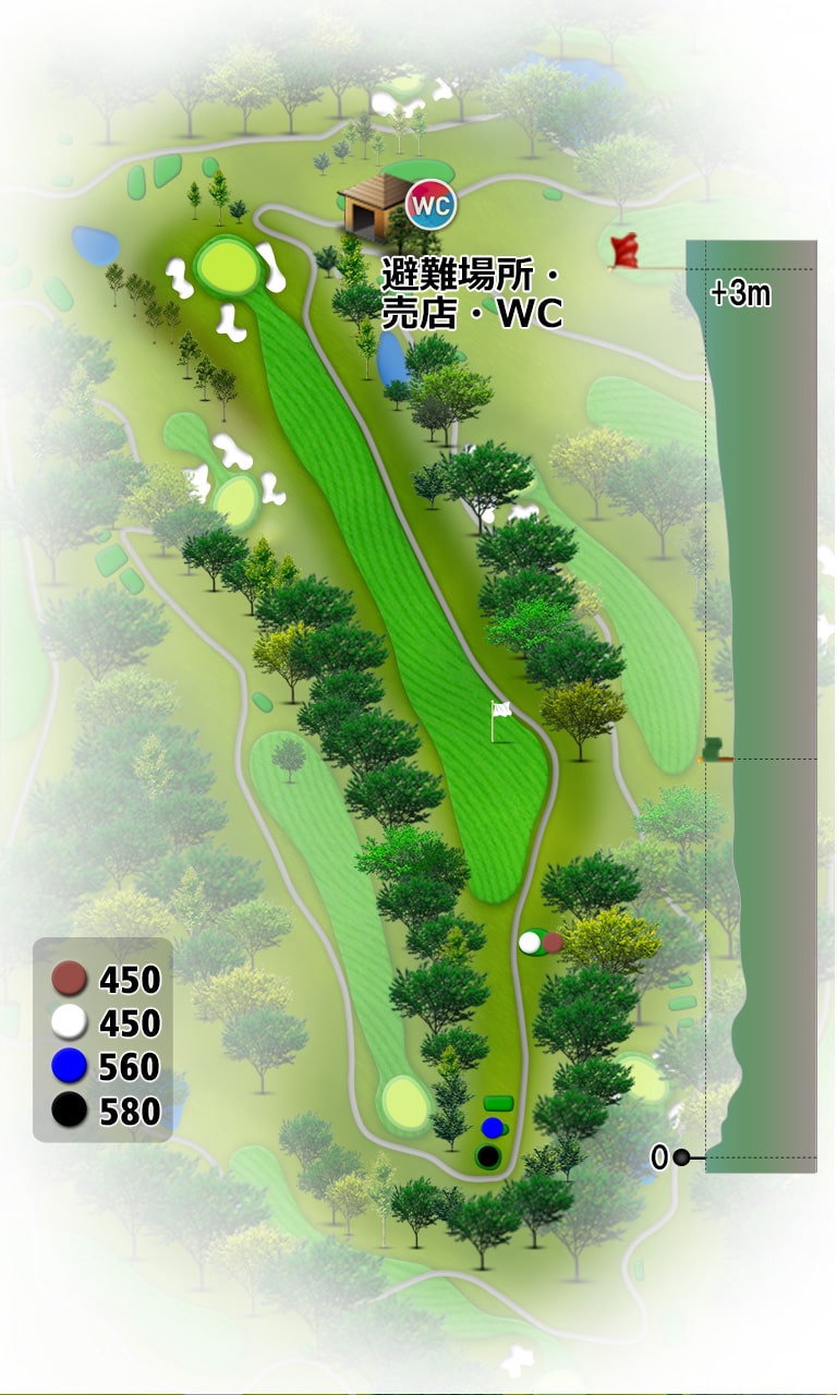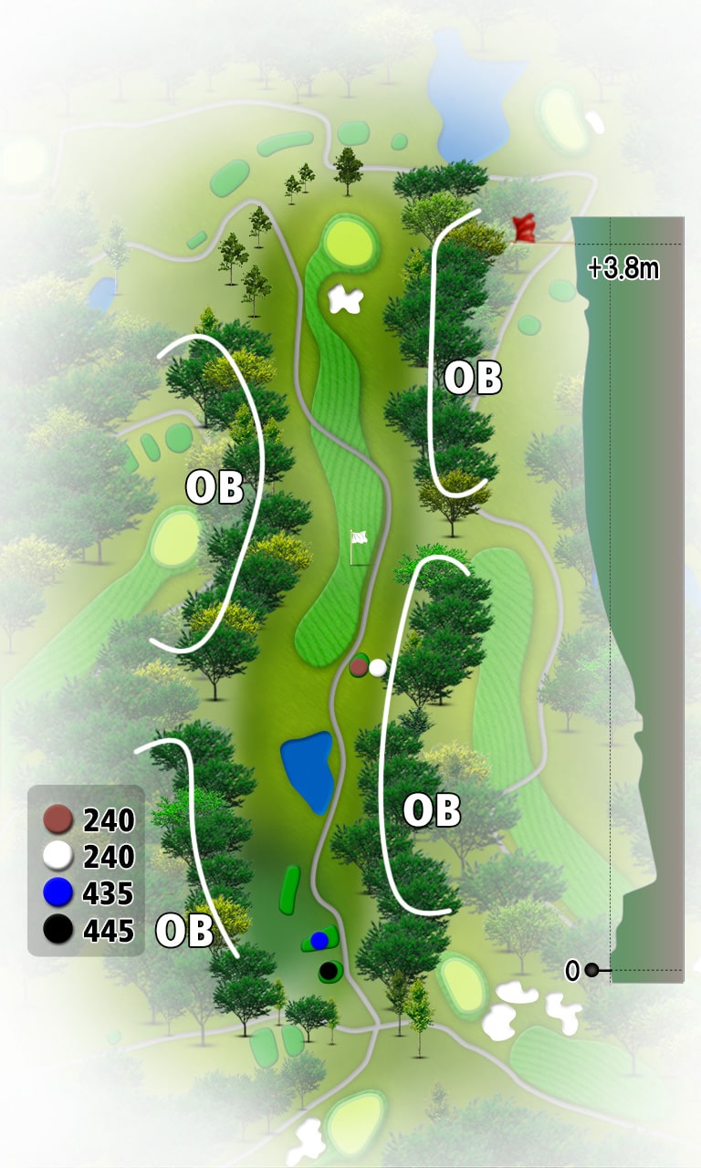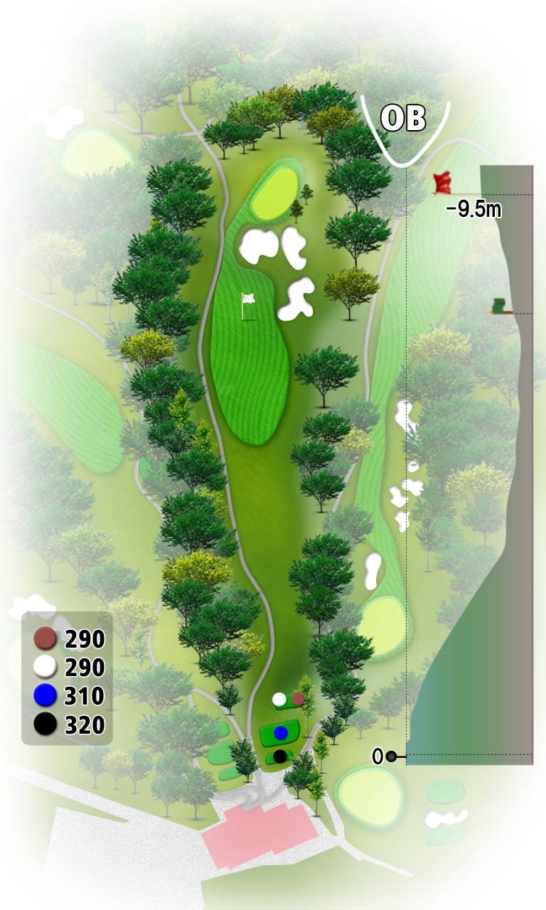 ドライバーを思いっきり振れるコースです。左林スレスレが狙い目。2打目も思いっきり振ってください。