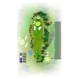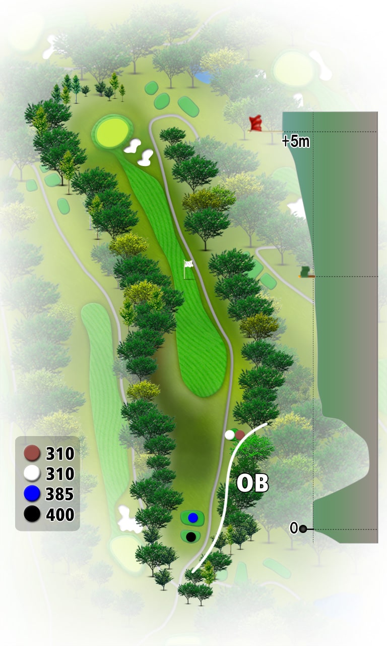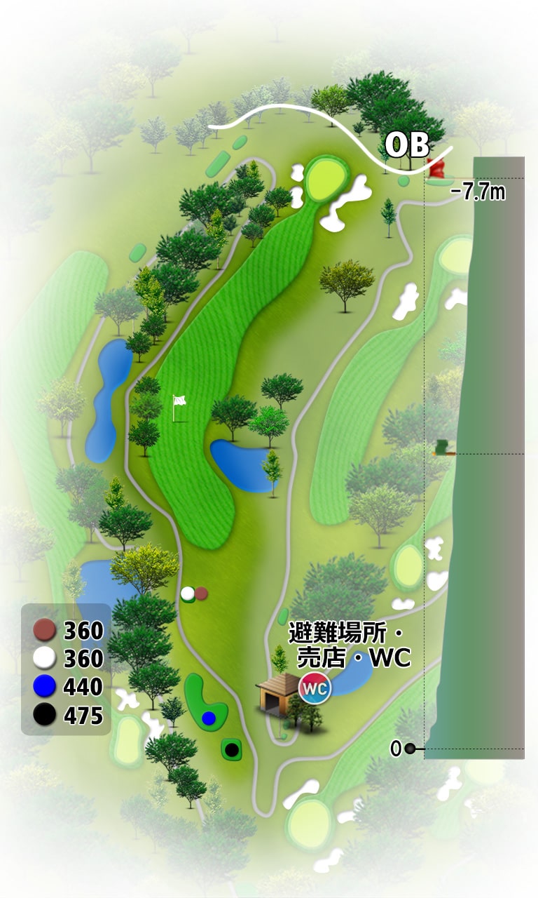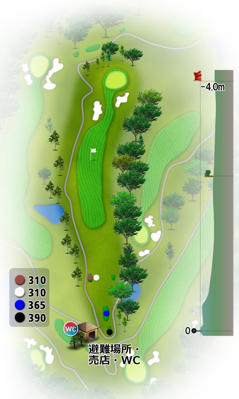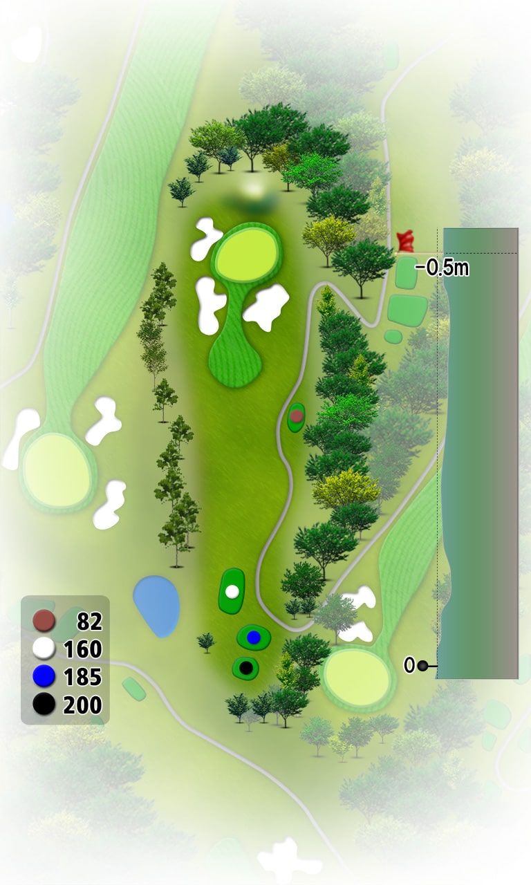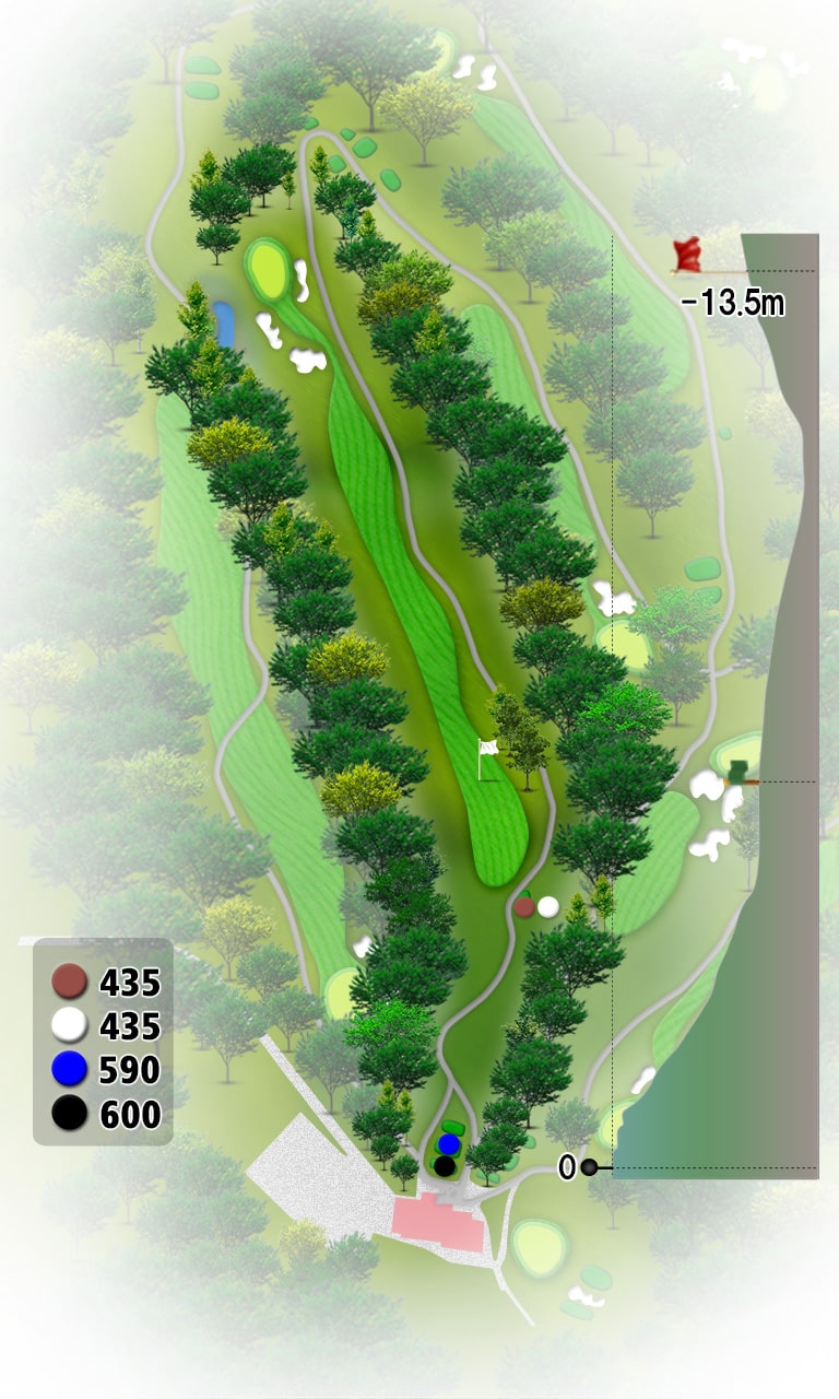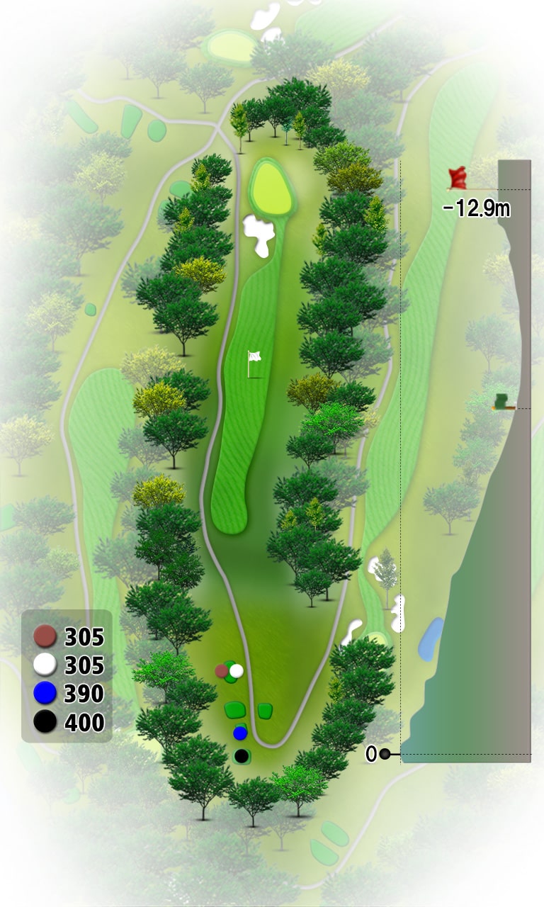 打ち下ろしのミドルホール。左側の林の丘を避けて思いっきり振ってください。グリーン周りのバンカーは要注意!