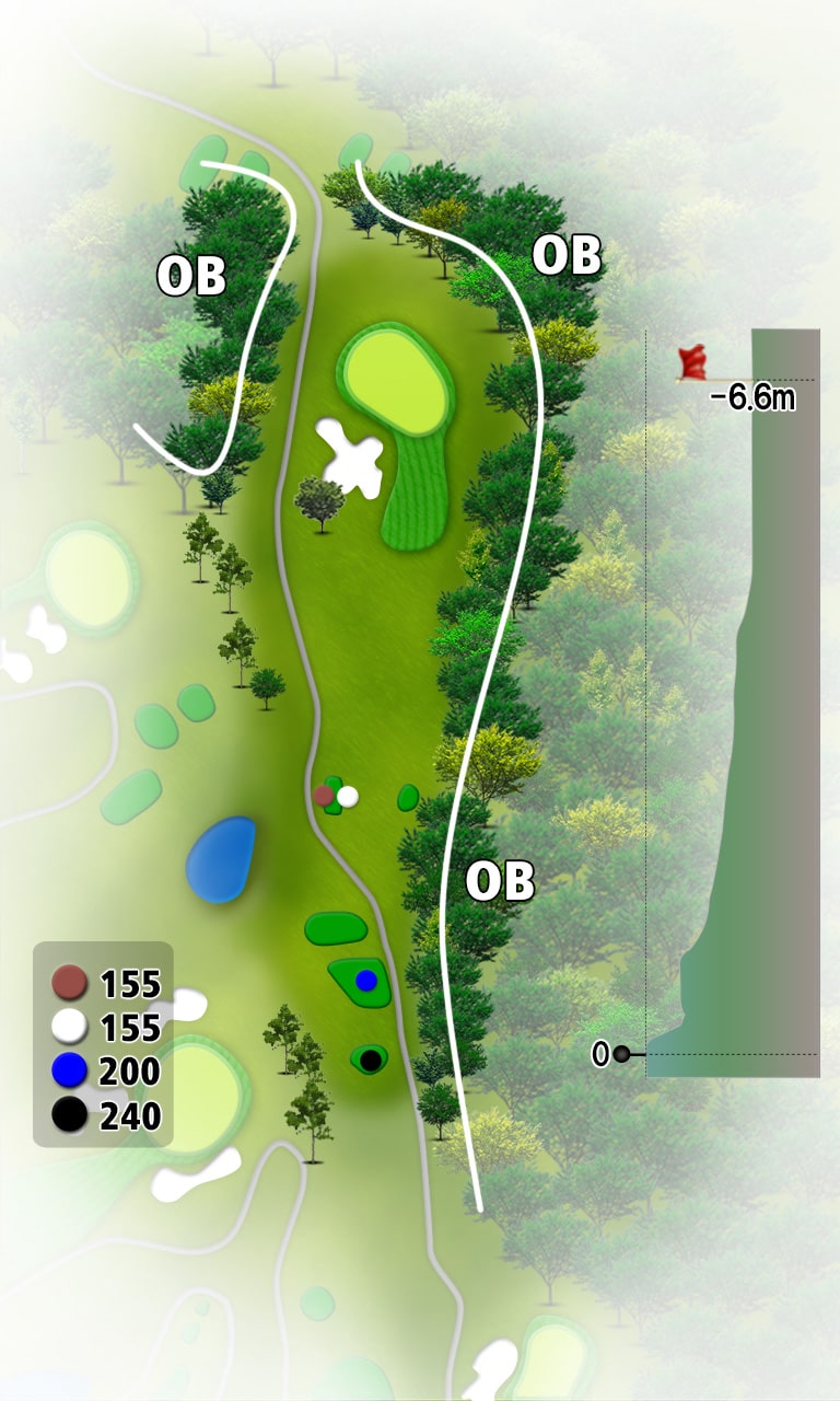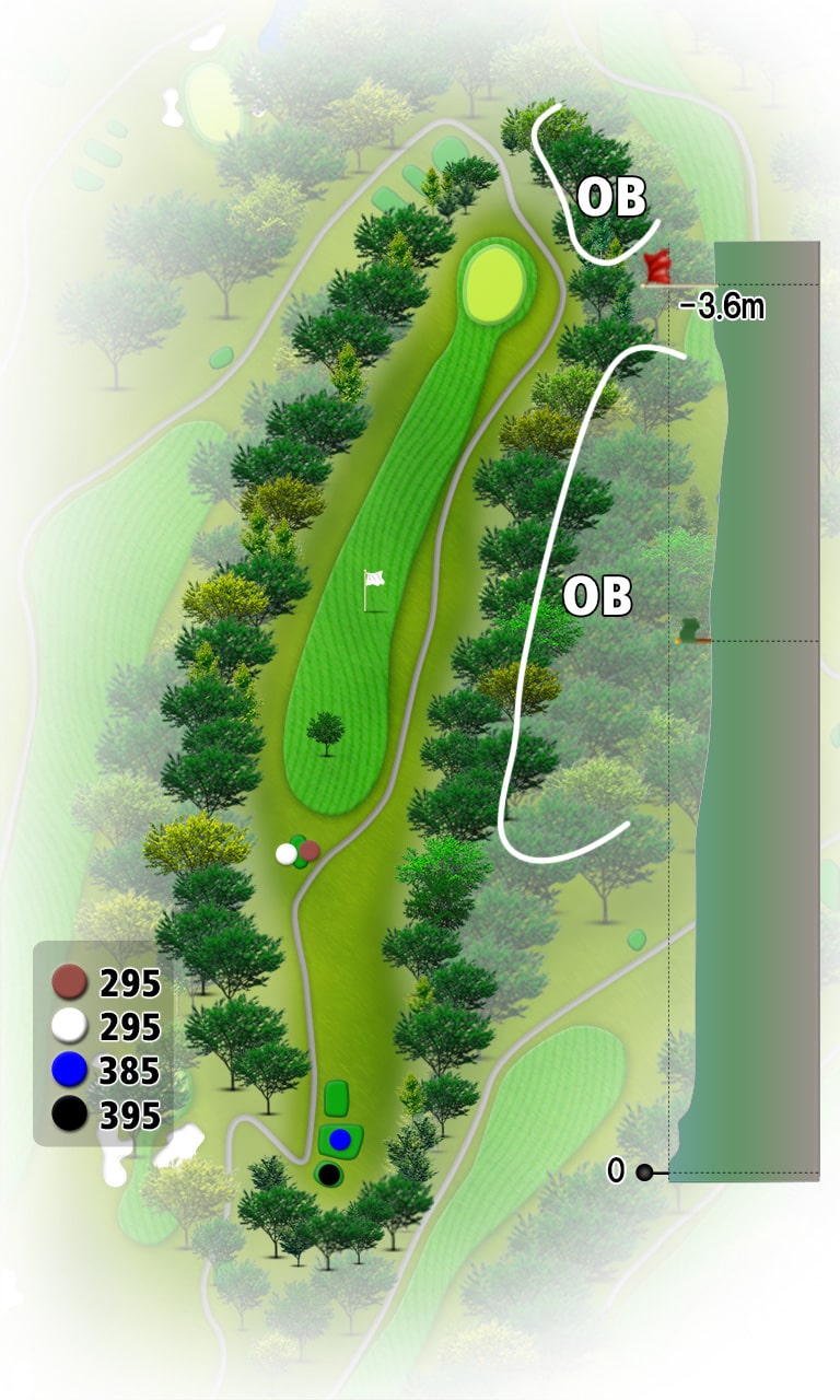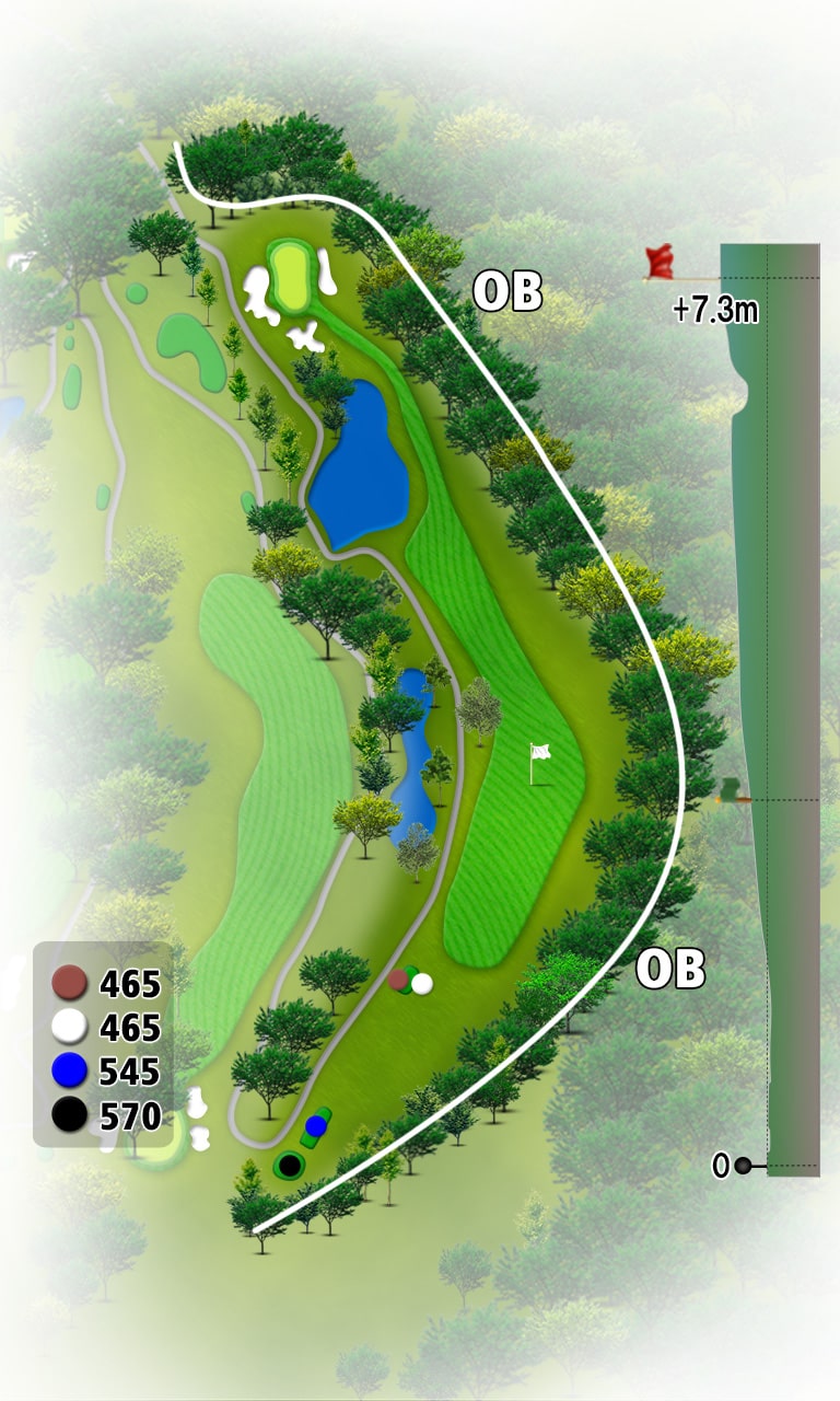 右側の池が要注意!ドライバーの飛距離を確認して一打目の方向を確認すること。グリーン奥はOBです。