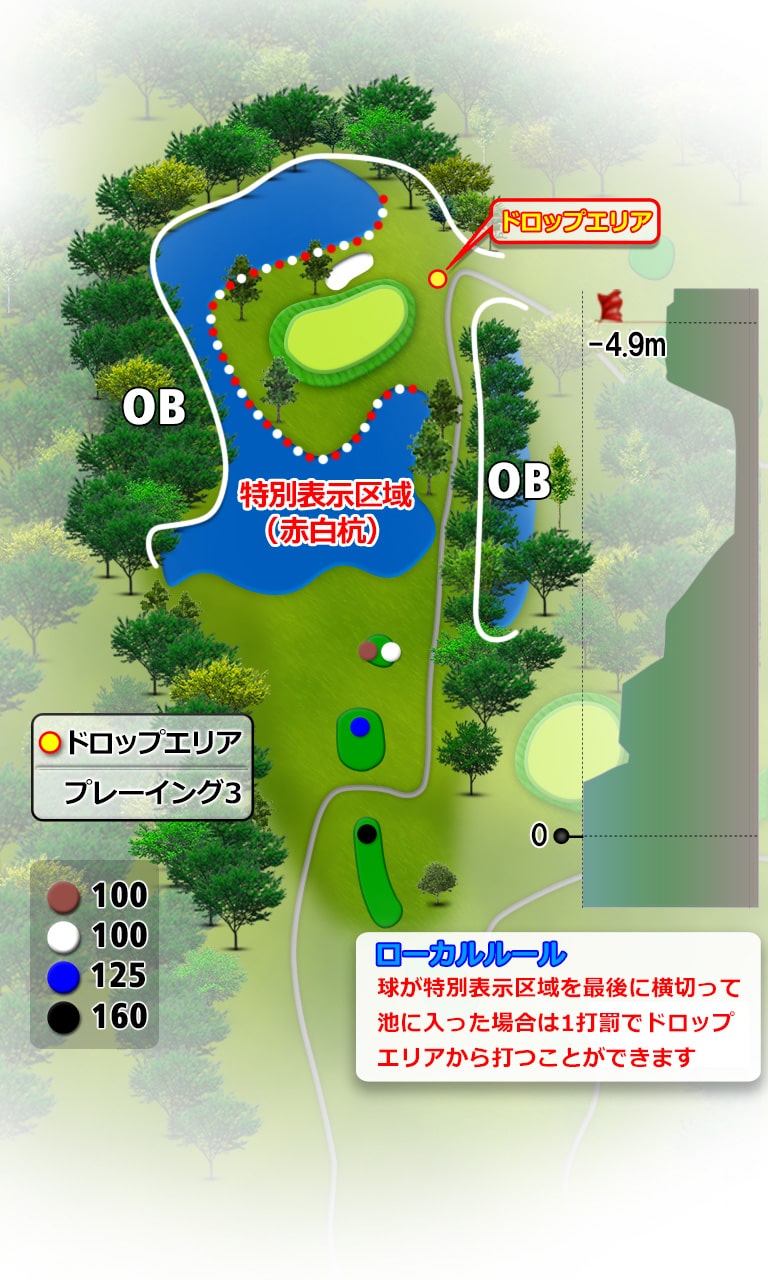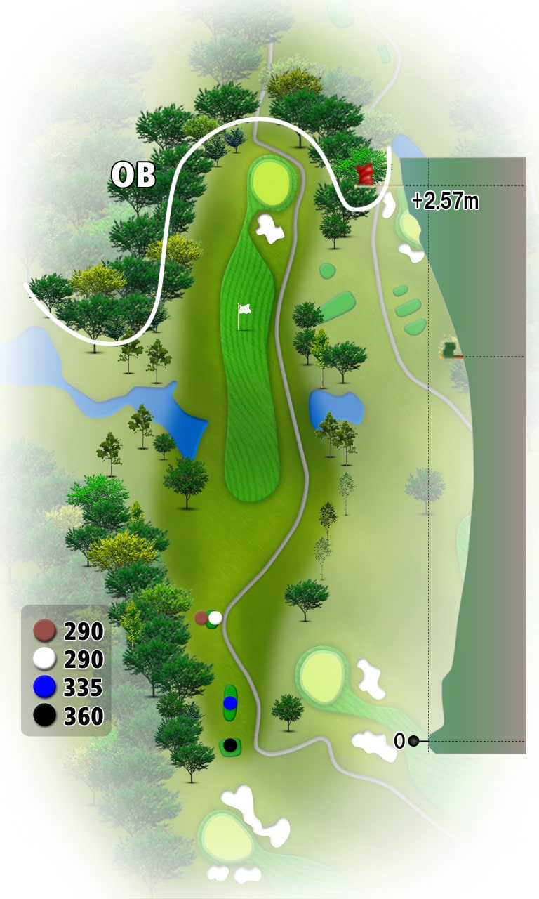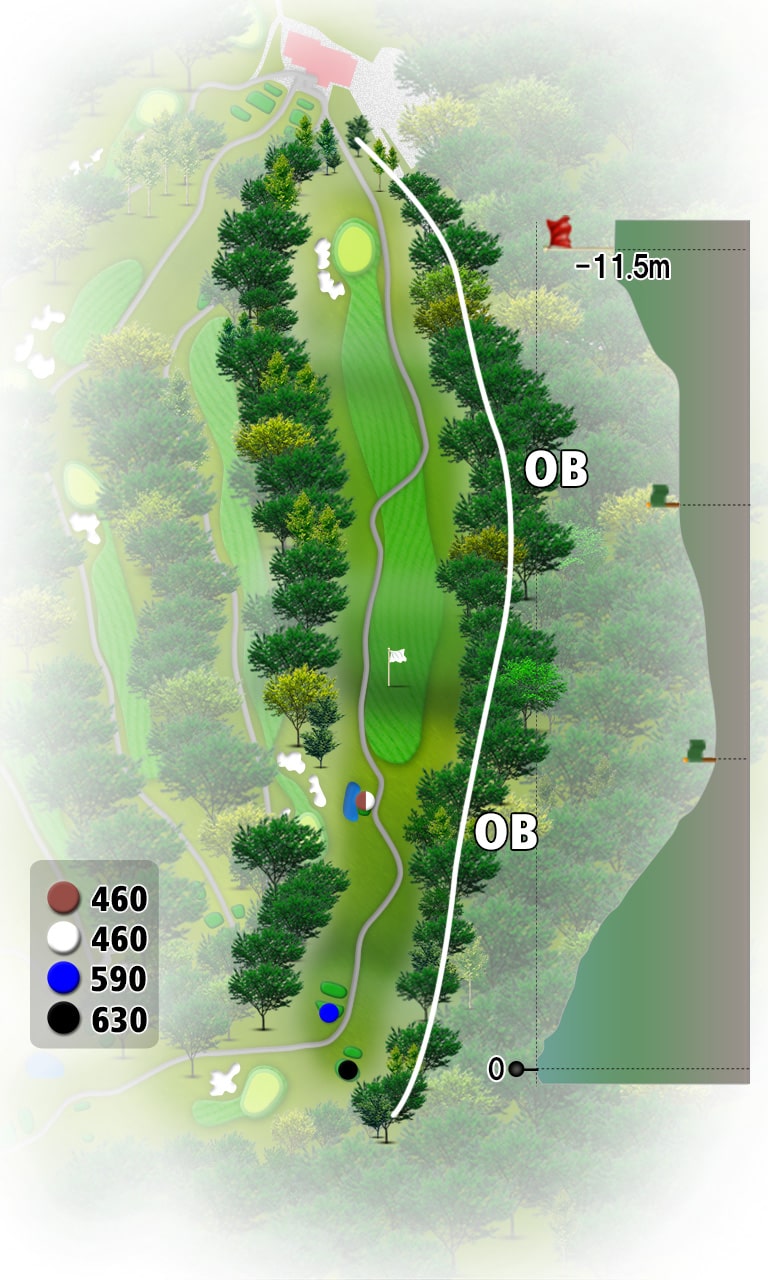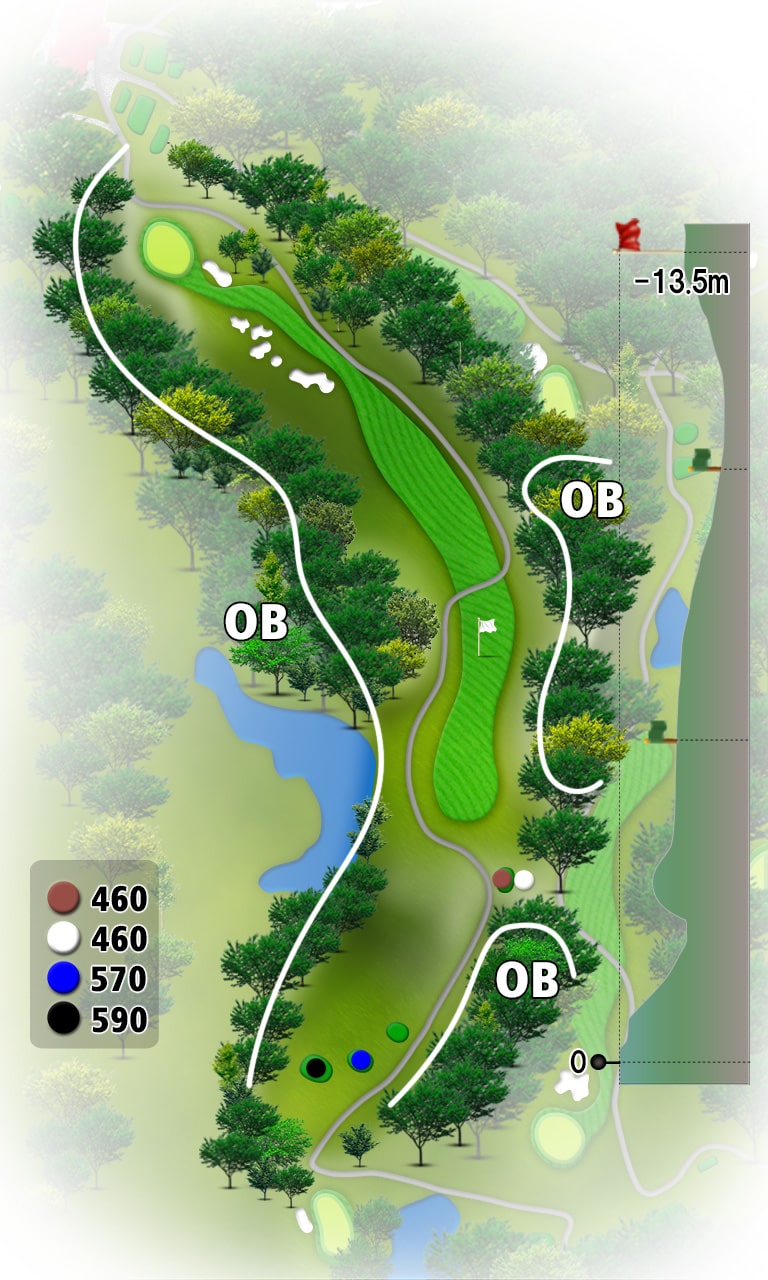右側の池が要注意!ドライバーの飛距離を確認して一打目の方向を確認すること。グリーン奥はOBです。