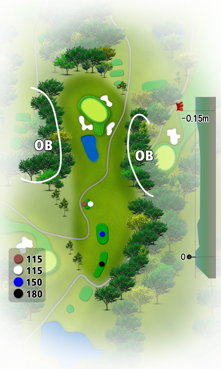 比較的距離のあるショートホール。右林はOBラインです。グリーン手前バンカーが気になりますが距離を合わせて打ってください。