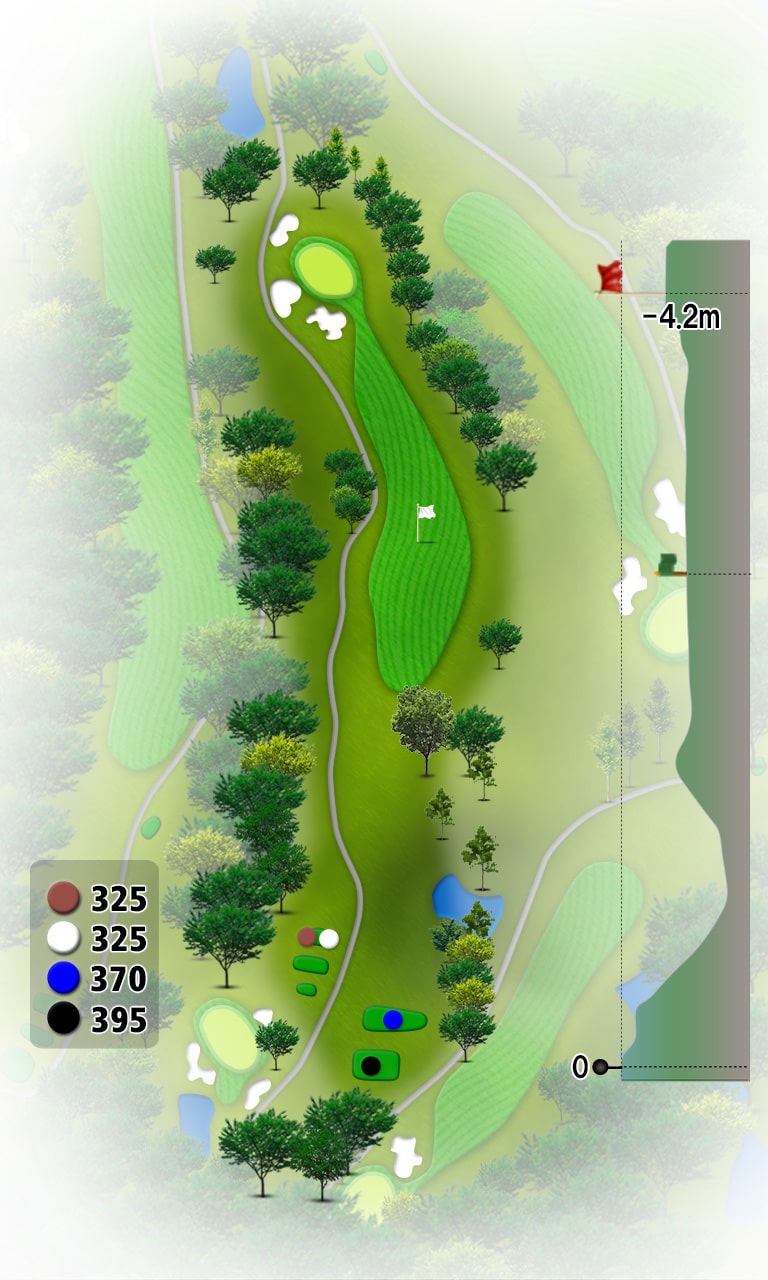 まっすぐなミドルホール。スライサーは要注意!左右の林が構えています。グリーンは2段グリーンです。